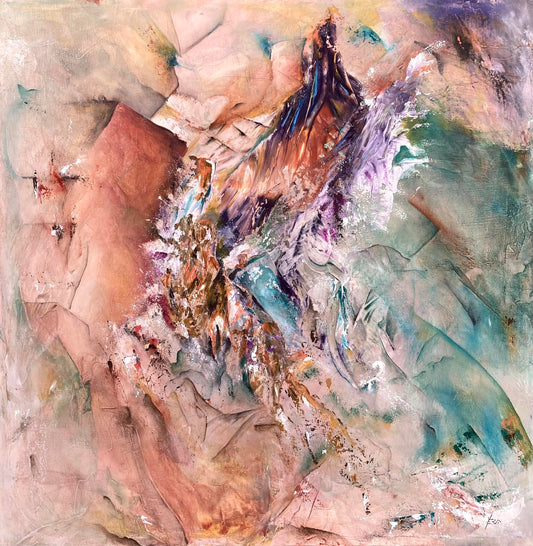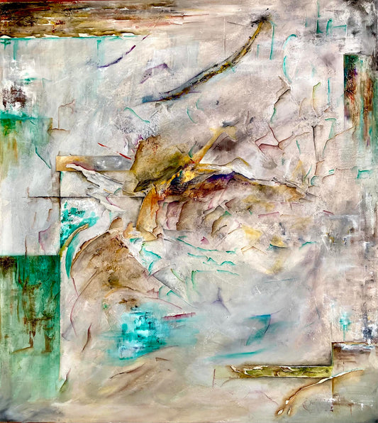 Las obras exhiben una materialidad envolvente que no se limita a la bidimensionalidad del lienzo. Hay una táctica de relieve, de incisiones y superposiciones que remite a la tradición del arte matérico, al uso de la materia como elemento expresivo en sí mismo. Con una paleta de color que oscila entre la etérea levedad de los tonos pasteles y la densidad de los