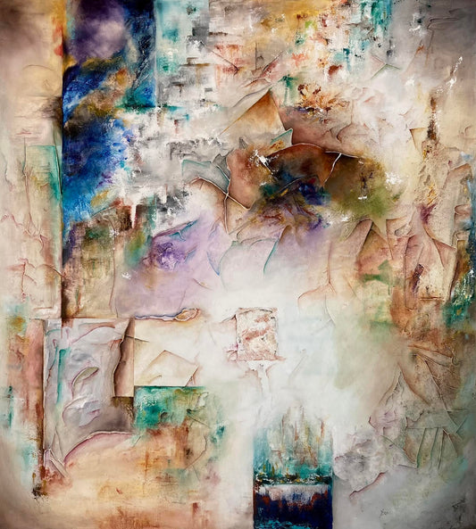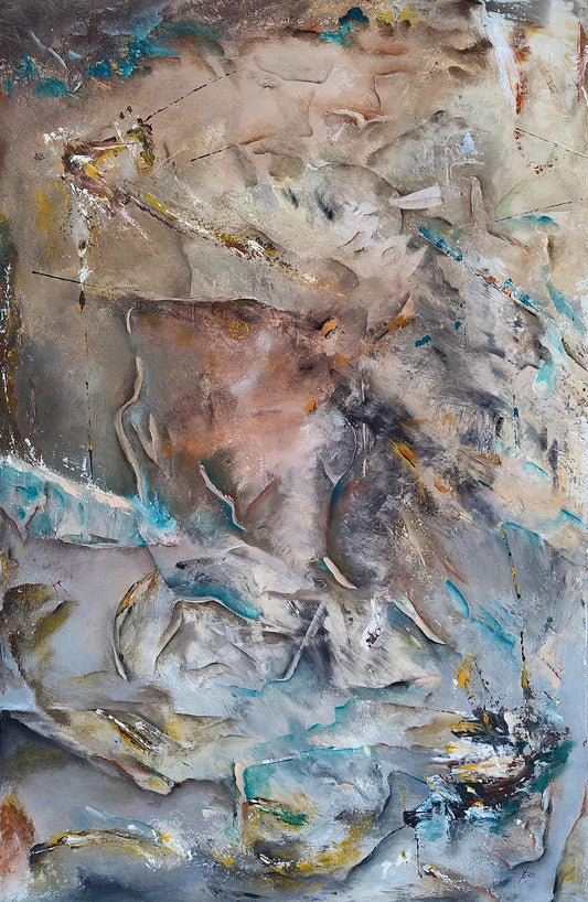 Las obras exhiben una materialidad envolvente que no se limita a la bidimensionalidad del lienzo. Hay una táctica de relieve, de incisiones y superposiciones que remite a la tradición del arte matérico, al uso de la materia como elemento expresivo en sí mismo. Con una paleta de color que oscila entre la etérea levedad de los tonos pasteles y la densidad de los azules nocturnos y los ocres terrosos, lo que refuerza la sensación de una cartografía afectiva, un territorio marcado por el paso del tiempo y la transformación de las emociones.