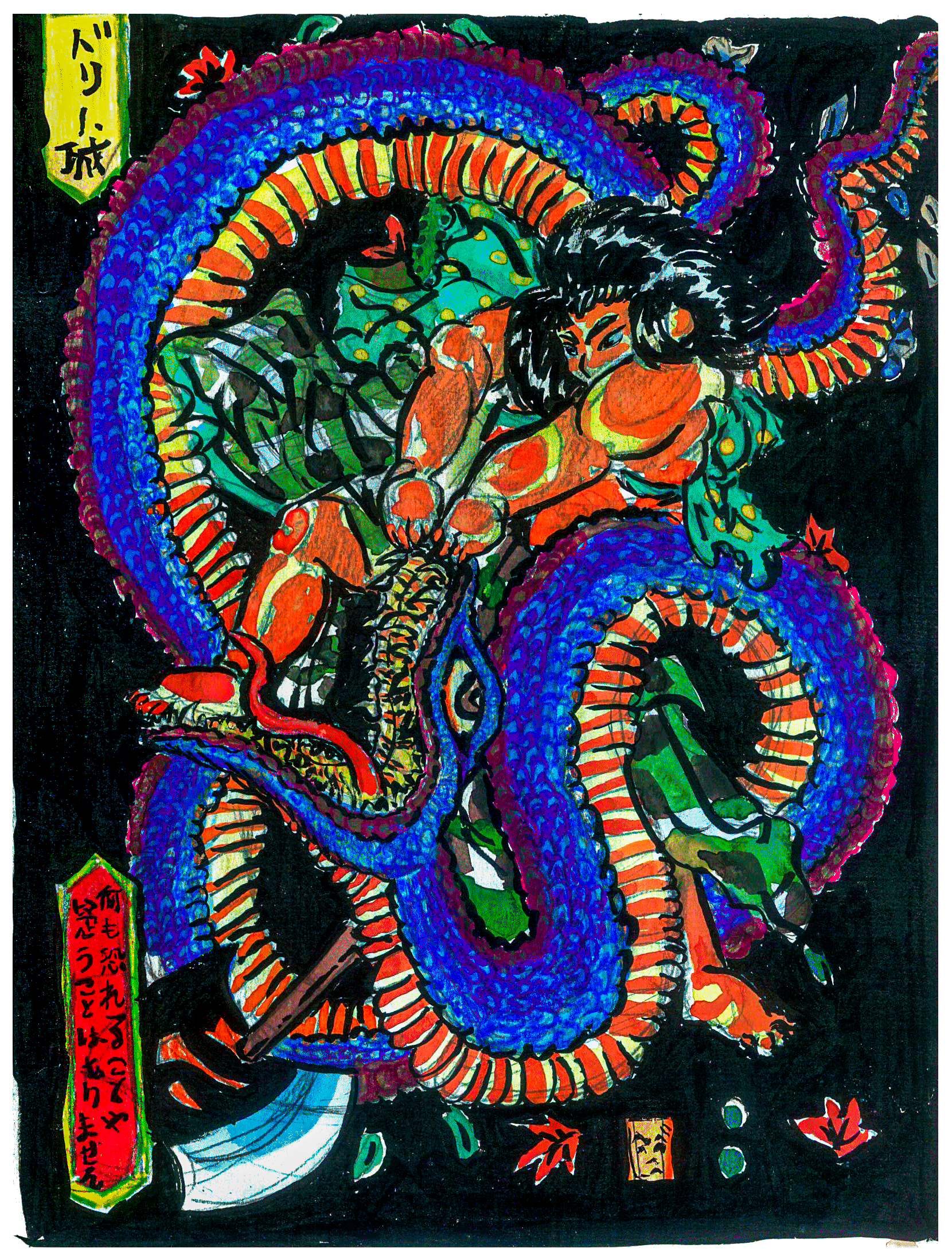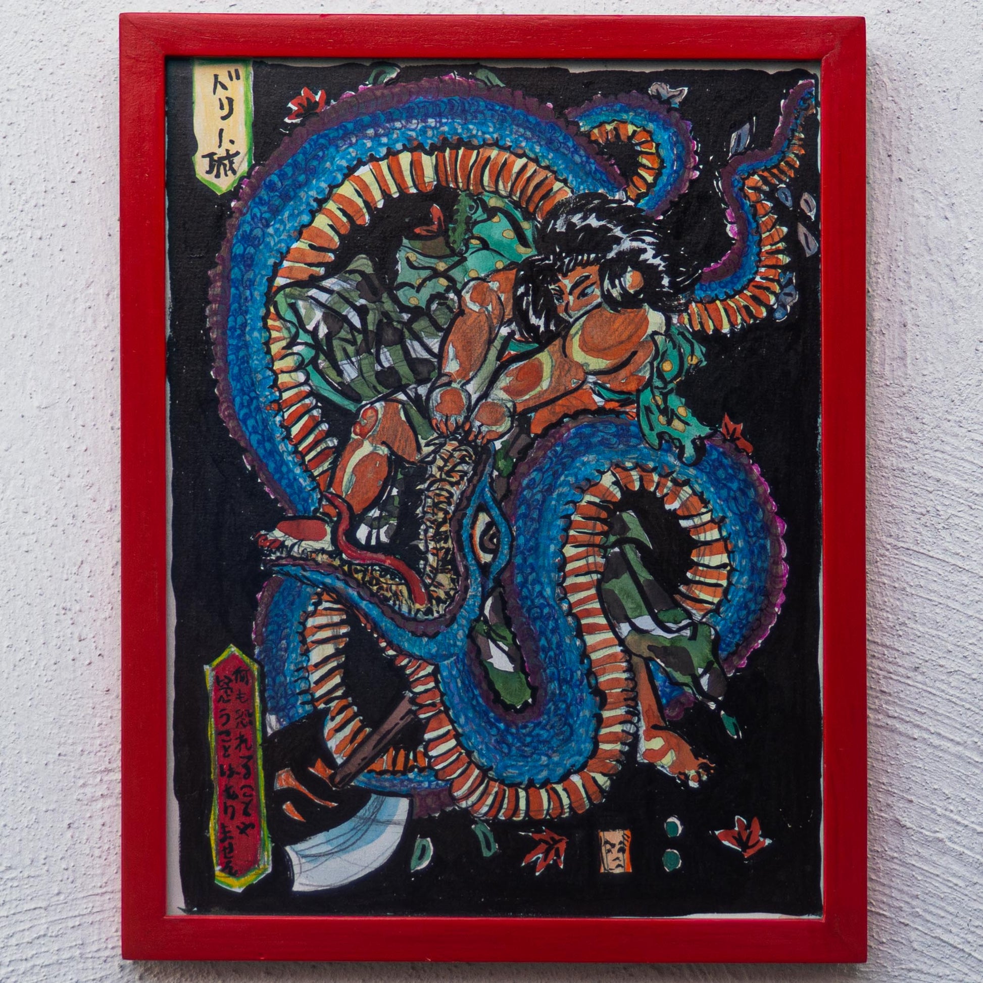 En la cultura japonesa, las serpientes son símbolos de protección, transformación y renovación, mientras que el guerrero representa la resiliencia, el valor y el honor. La postura intensa y las formas entrelazadas generan una tensión dinámica, destacando la batalla ancestral entre lo salvaje y lo humano. La vívida paleta de colores y las líneas marcadas transmiten fuerza y movimiento, haciendo eco de las tradiciones del ukiyo-e.