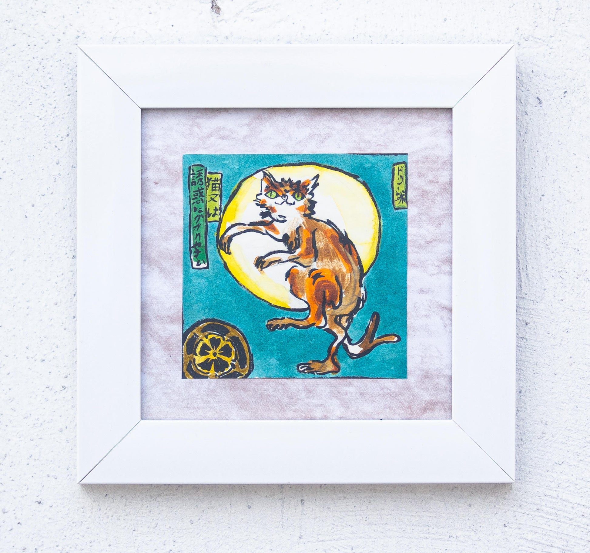La inclusión de una estampa que alude al clan Oda establece un vínculo entre la mística del gato y la historia del Japón feudal. Los colores vibrantes y el fondo contrastan con la figura del nekomata, destacando su naturaleza sobrenatural y enigmática. La técnica empleada imita el estilo de las impresiones tradicionales japonesas, pero con un enfoque en la travesura de este legendario gato.