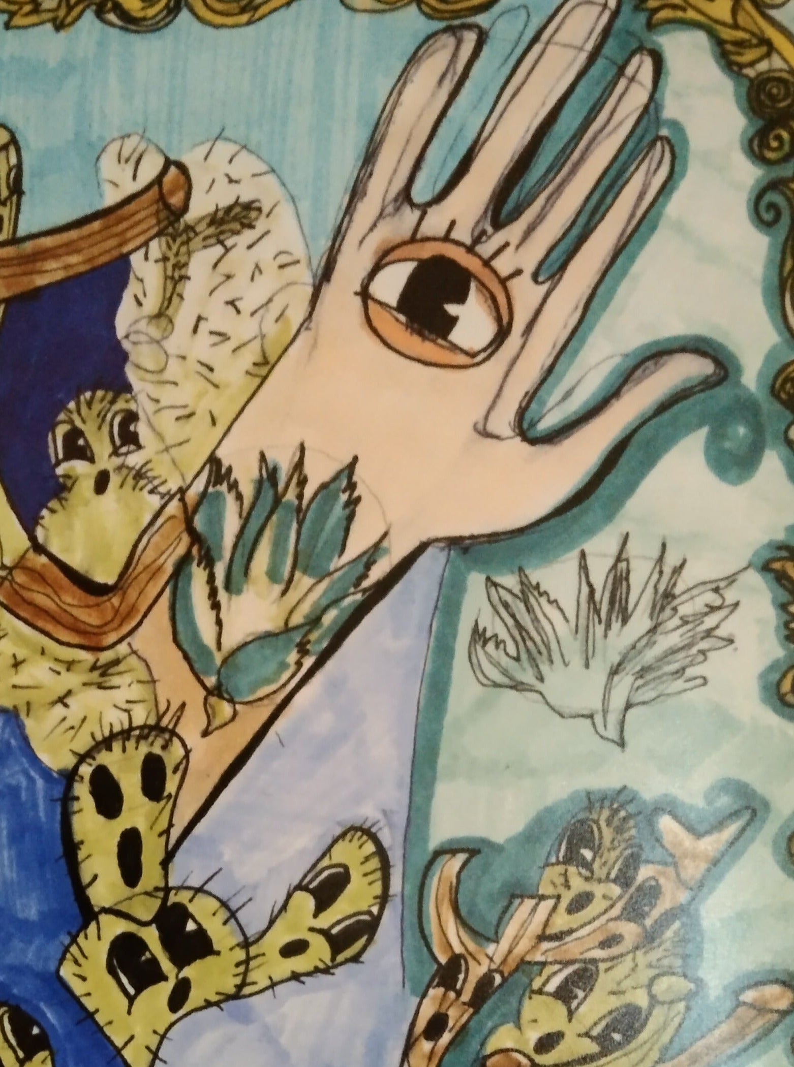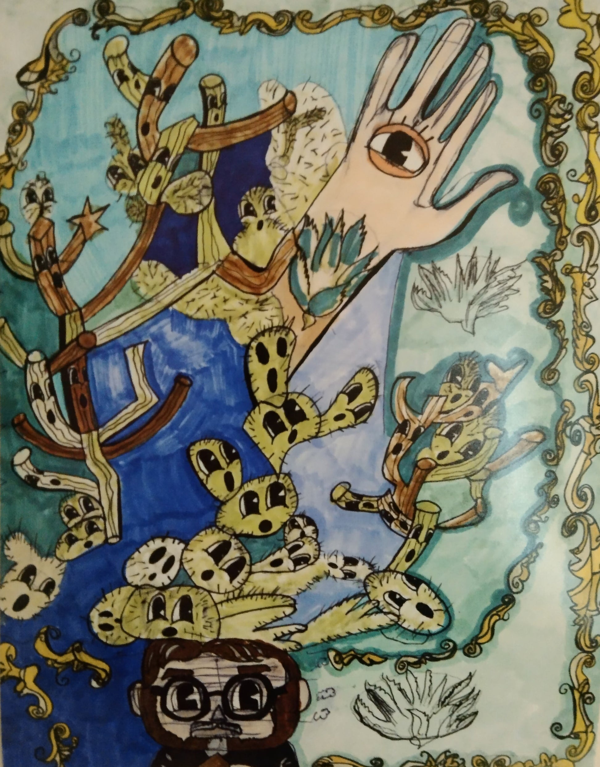 Descripción de la obra. Una mano con un ojo en un paisaje mexicano que incluye una sábila y varios cactus. En el centro del dibujo se encuentra Guillermo del Toro.