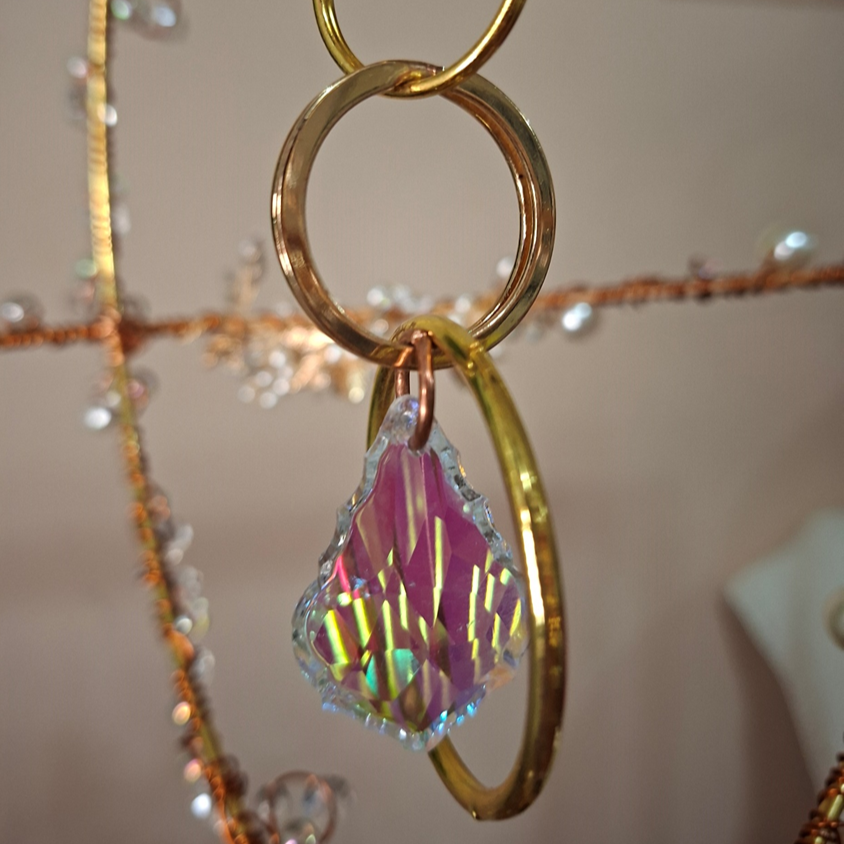 Al centro cuelga un dije romboide iridiscente de unas cadenas hechas de argollas doradas. Ideal para adornar nichos, balcones, pasillos, ventanales, esquinas, consultorios, despachos, árboles, adornos interiores y donde reciba la luz eléctrica o rayos de sol para que se reflejen sutilmente a su alrededor lucecitas del arco iris. exteriores, teniendo cuidado de no exponerlo largo tiempo a la lluvia.