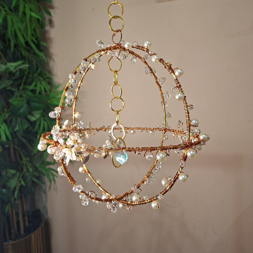 Bello adorno dorado hecho con 3 aros metálicos dorados enrollados a ellos con hilo de cobre 99% puro, perlitas sintéticas y cuentitas de cristal facetado y embelleciéndolo 2 ramitos de mini perlitas plásticas con dorado.