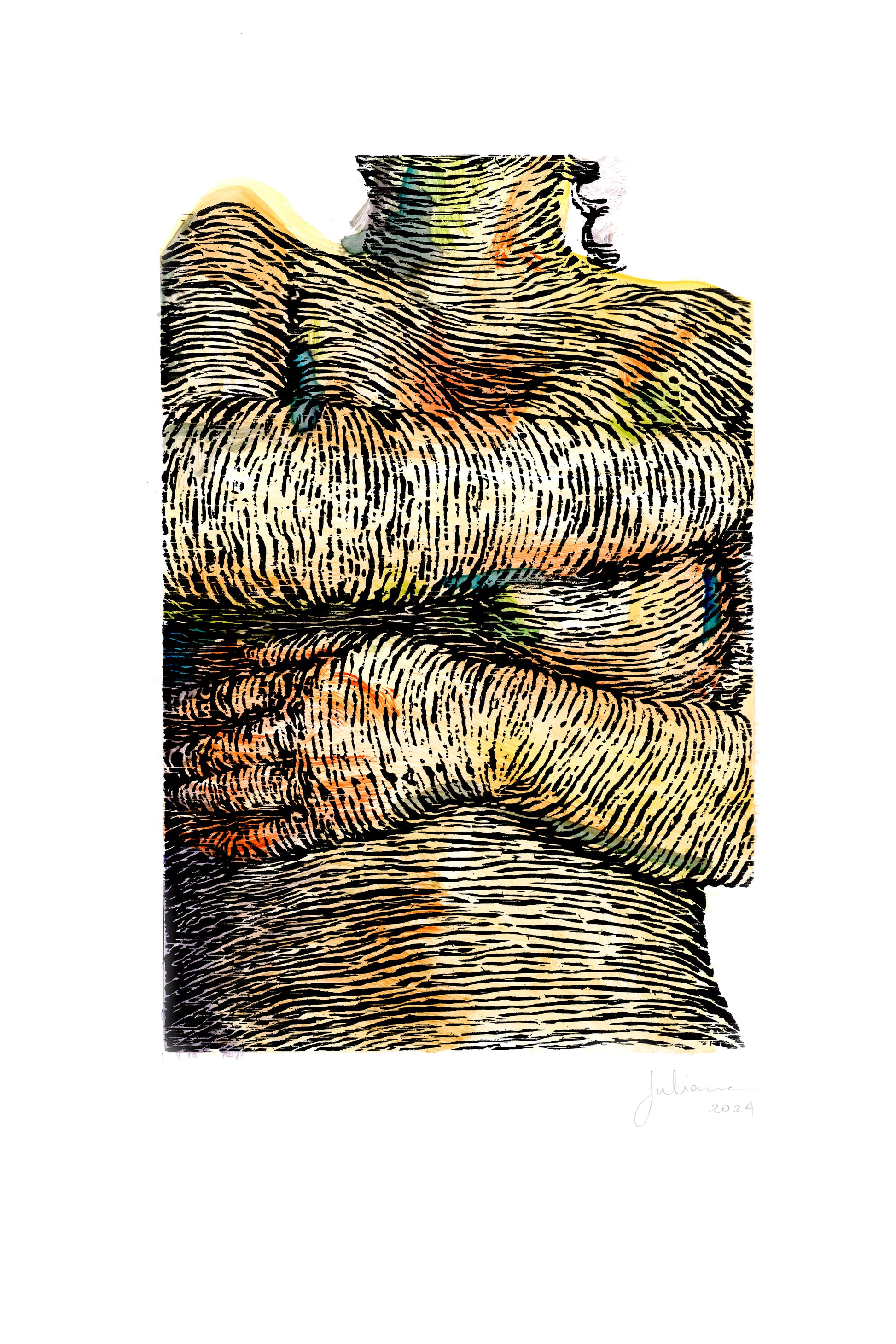 A través de la serie, retrato mi cuerpo tal como es, con sus texturas, volúmenes y particularidades — pliegues, estrías y manchas — en un contexto íntimo y personal. Al hacerlo, reivindico mi cuerpo como mi verdadero hogar, celebrando su presencia y la vida que me permite vivir. Mi objetivo es desafiar los ideales estéticos impuestos y abrazar la belleza intrínseca de la individualidad y la autenticidad, mostrando que el cuerpo, en su forma más genuina, merece, solamente, existir.