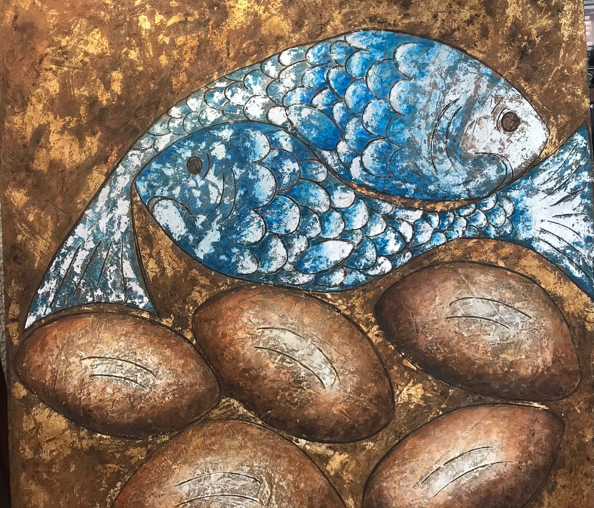 5 panes y 2 peces está hecha sobre tela con técnica mixtas que incluye acrílico, pasta, hojas de oro y plata.