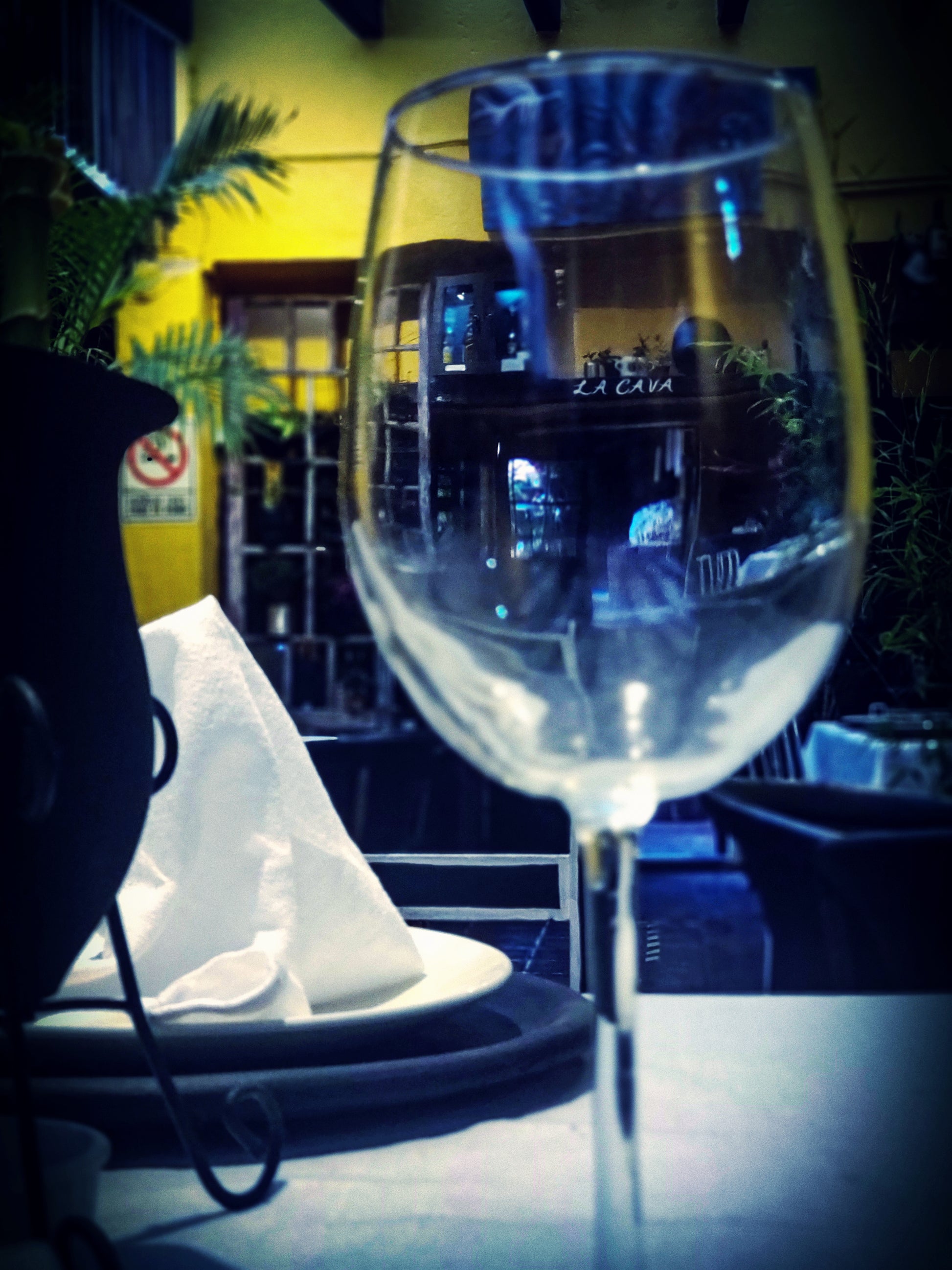 En un restaurante del pueblo mágico de Metepec, Edo. de México, viendo a través de la copa la cava del lugar.