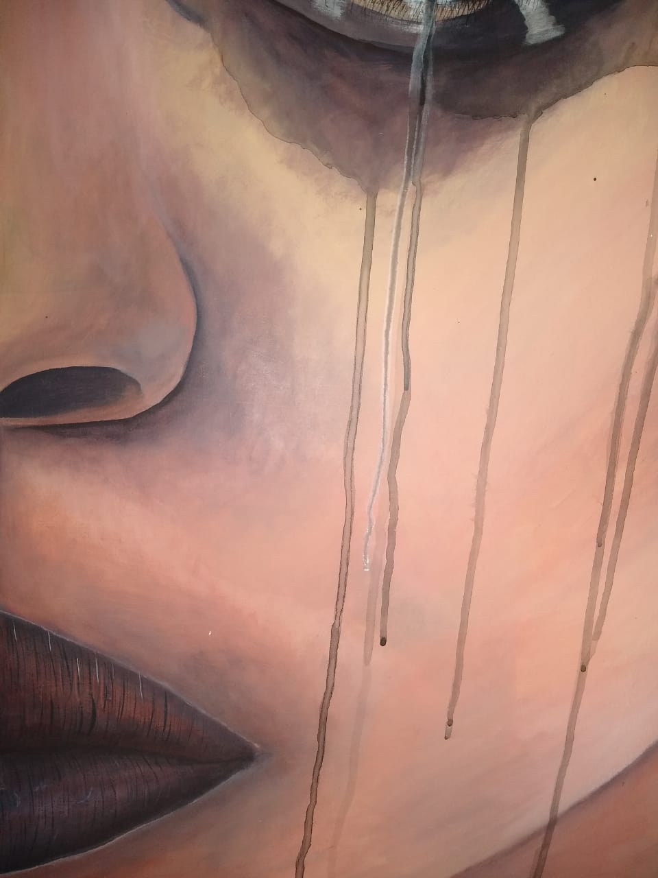 A través de la mirada es una obra que nos habla sobre el maltrato, acoso, pero sobre todo la violencia a la mujer. Está realizada con una paleta de colores fríos.