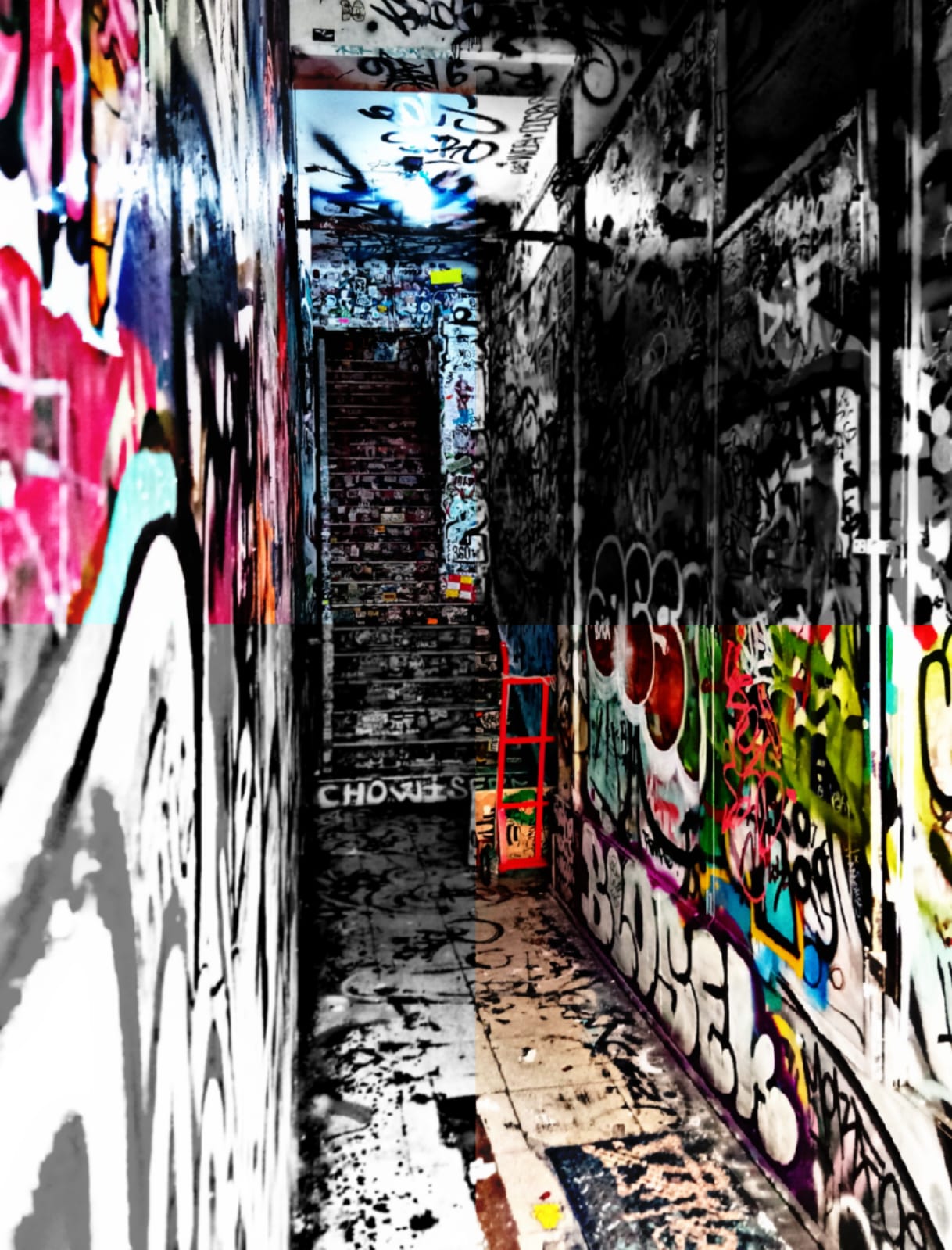 Abandone toda esperanza aquel que entra aquí es una referencia a la entrada al infierno, el ambiente clandestino e invadido de arte urbano, nos recuerda lo caótico que es la vida en la ciudad