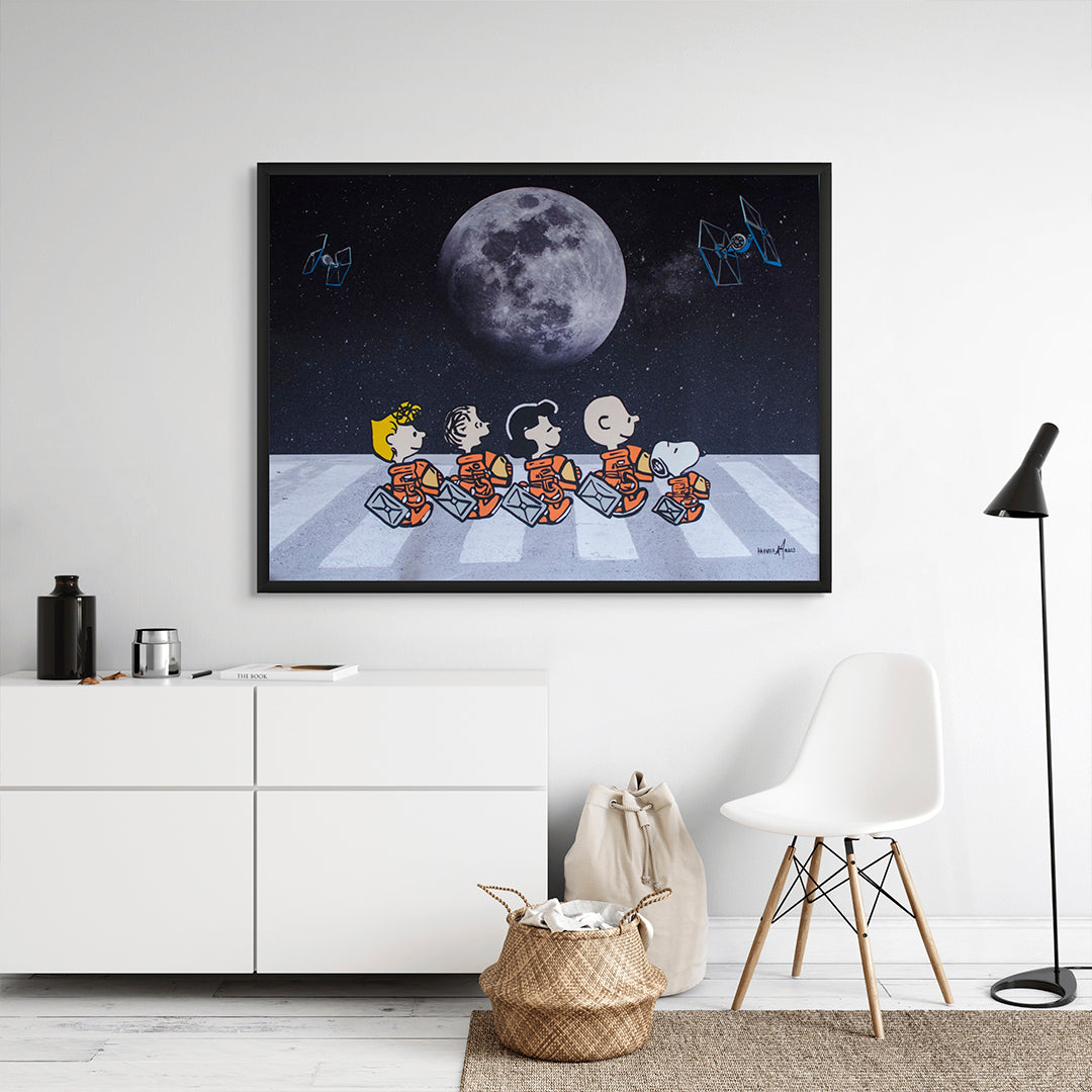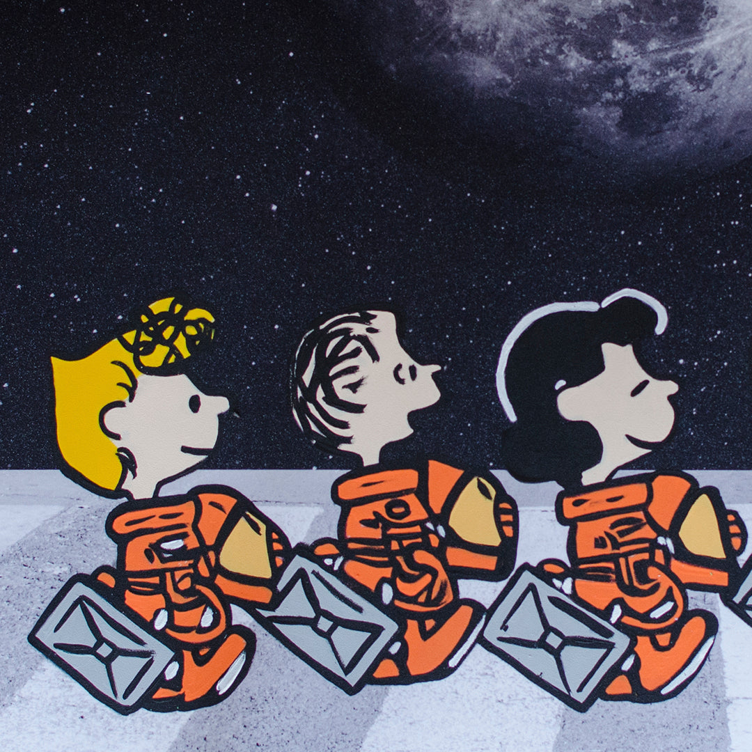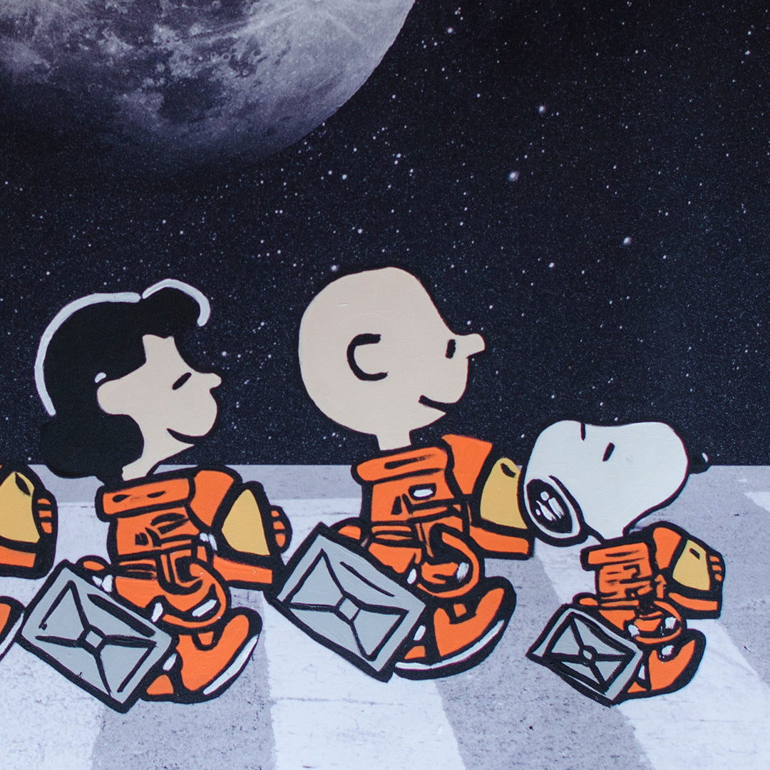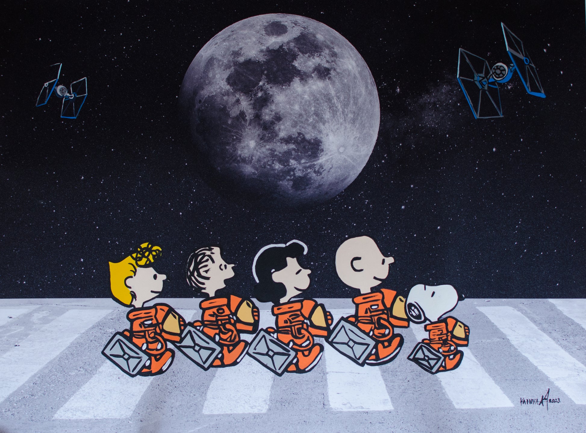 Fotografía inspirada en mi serie Lúa donde el paisaje siempre son lunas interactuando con personajes de nuestro imaginario de la niñez, los personajes son pintados con pintura acrílica sobre una fotografía de mi autoría que es la luna y la calle