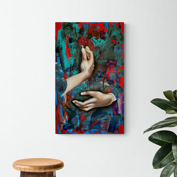 Siento que esta obra representa el abrazo místico a lo infinito, en una mezcla entre lo abstracto y lo figurativo, basado en un boceto renacentista de Leonardo Davinci.