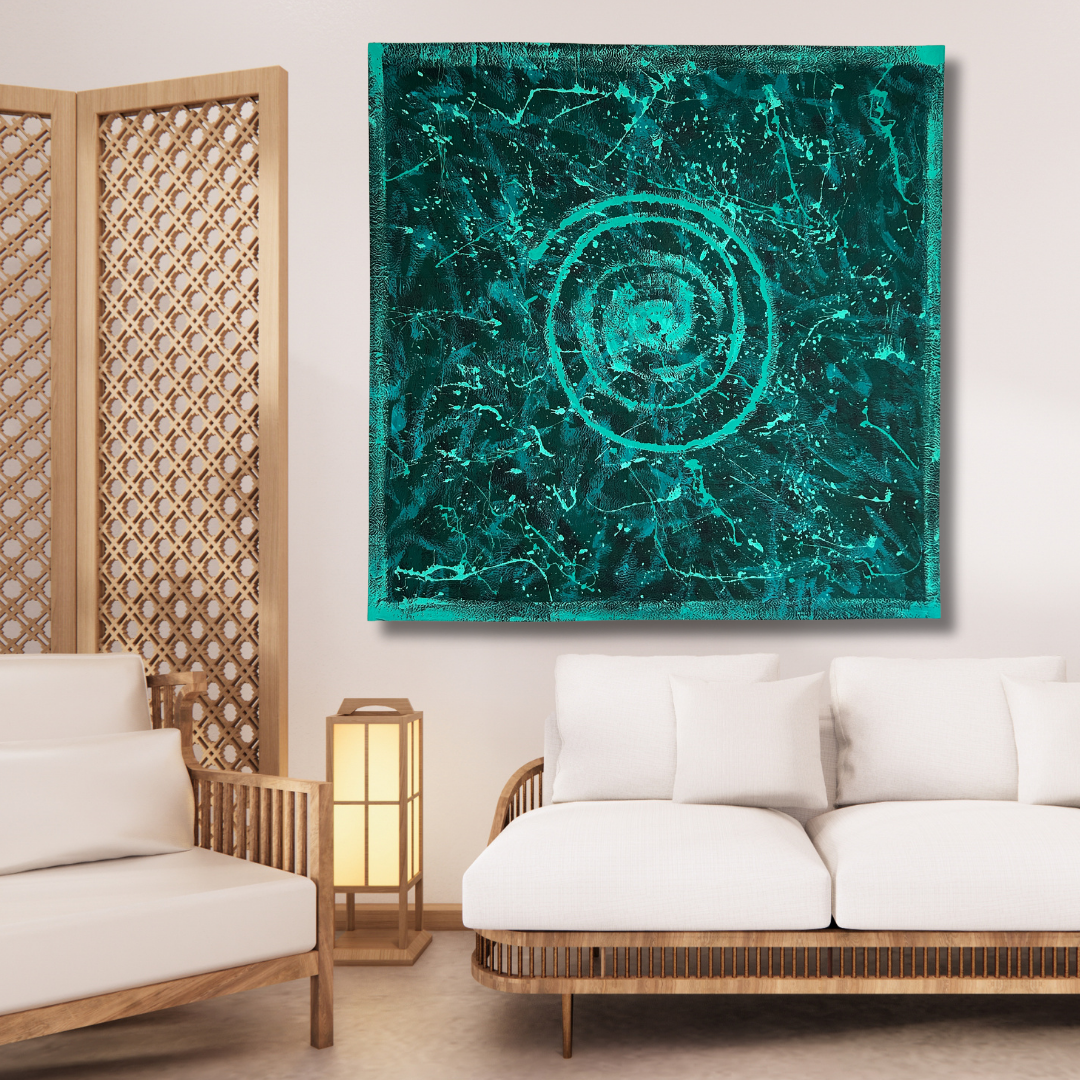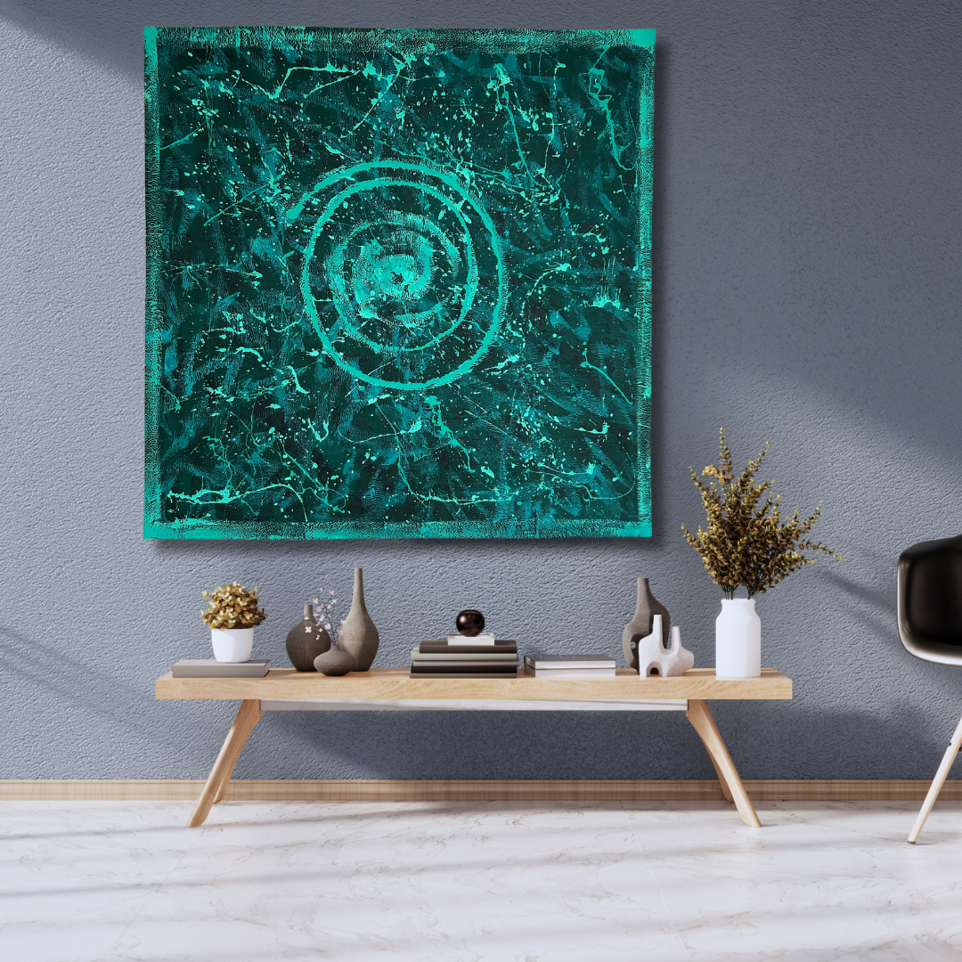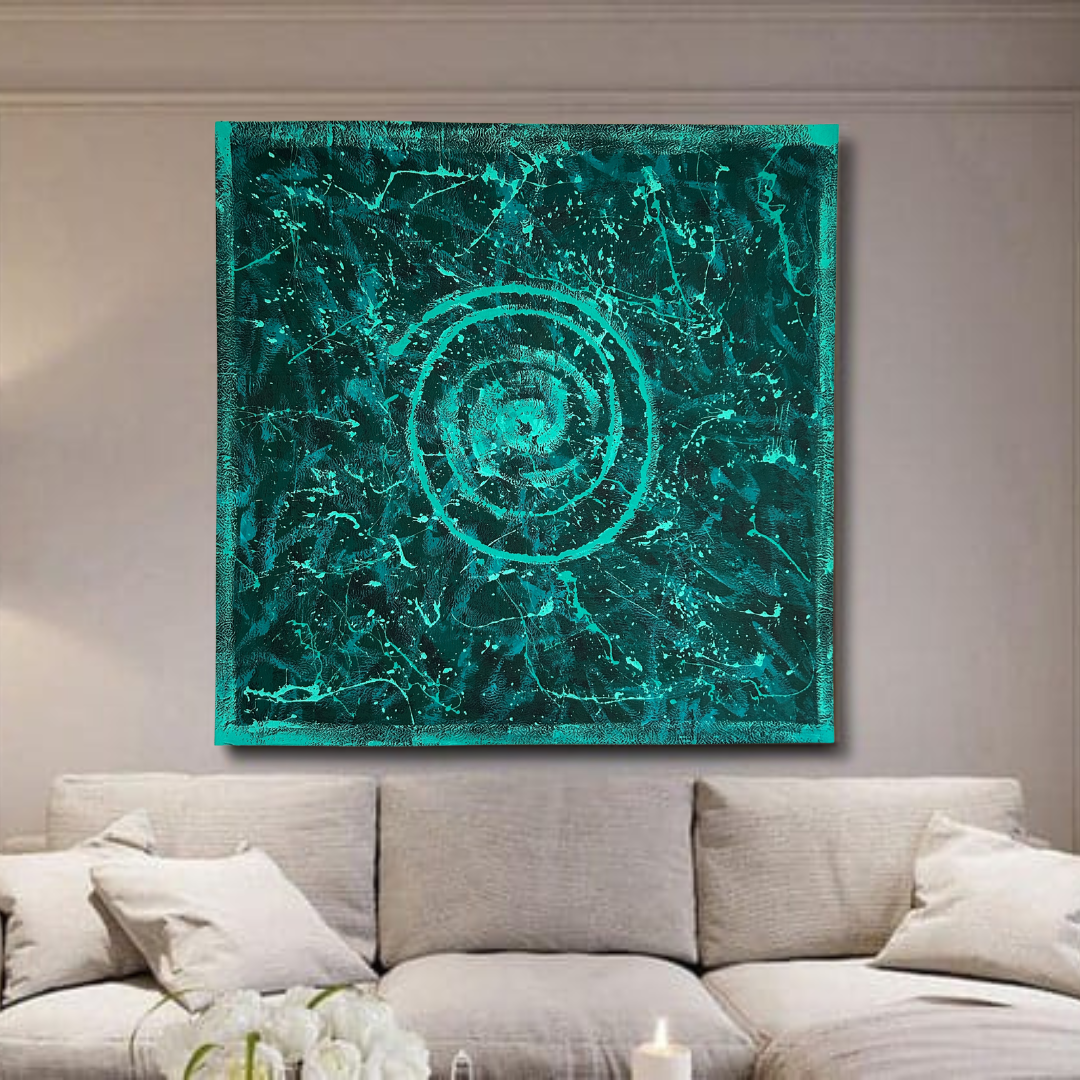 Sumérjase en la profundidad magnética del "Vórtice Esmeralda", una pieza magistral que no solo decora, sino que transforma el espacio en un santuario de sofisticación y misterio. "Vórtice Esmeralda", es un lienzo de energía y misterio, dada la paleta de turquesa oscuro y vibrante, la textura gestual y el espiral central que evoca un vórtice o un portal.