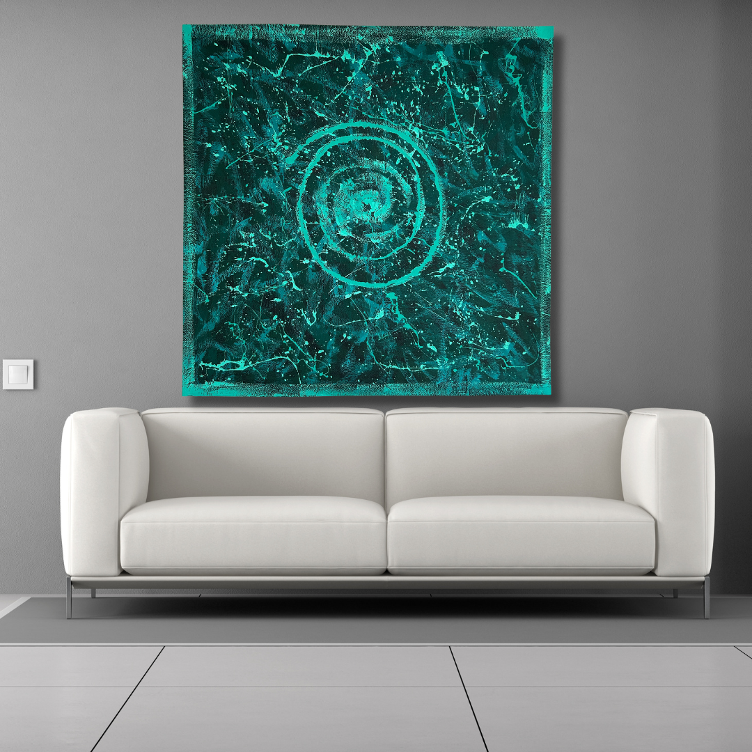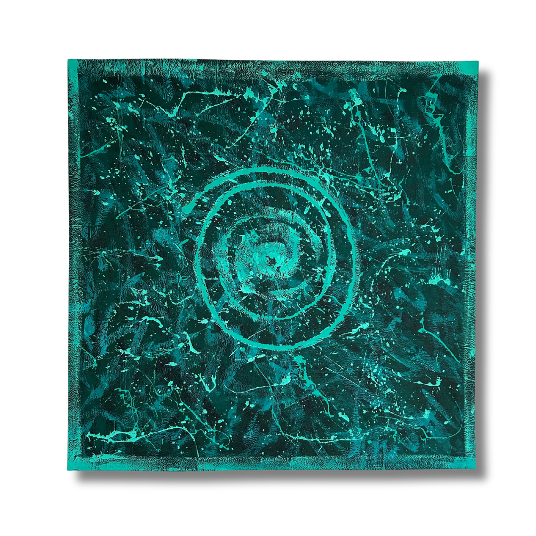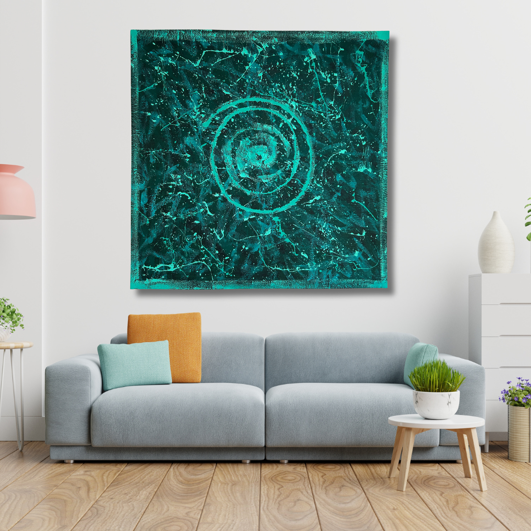 Sumérjase en la profundidad magnética del "Vórtice Esmeralda", una pieza magistral que no solo decora, sino que transforma el espacio en un santuario de sofisticación y misterio. "Vórtice Esmeralda", es un lienzo de energía y misterio, dada la paleta de turquesa oscuro y vibrante, la textura gestual y el espiral central que evoca un vórtice o un portal.