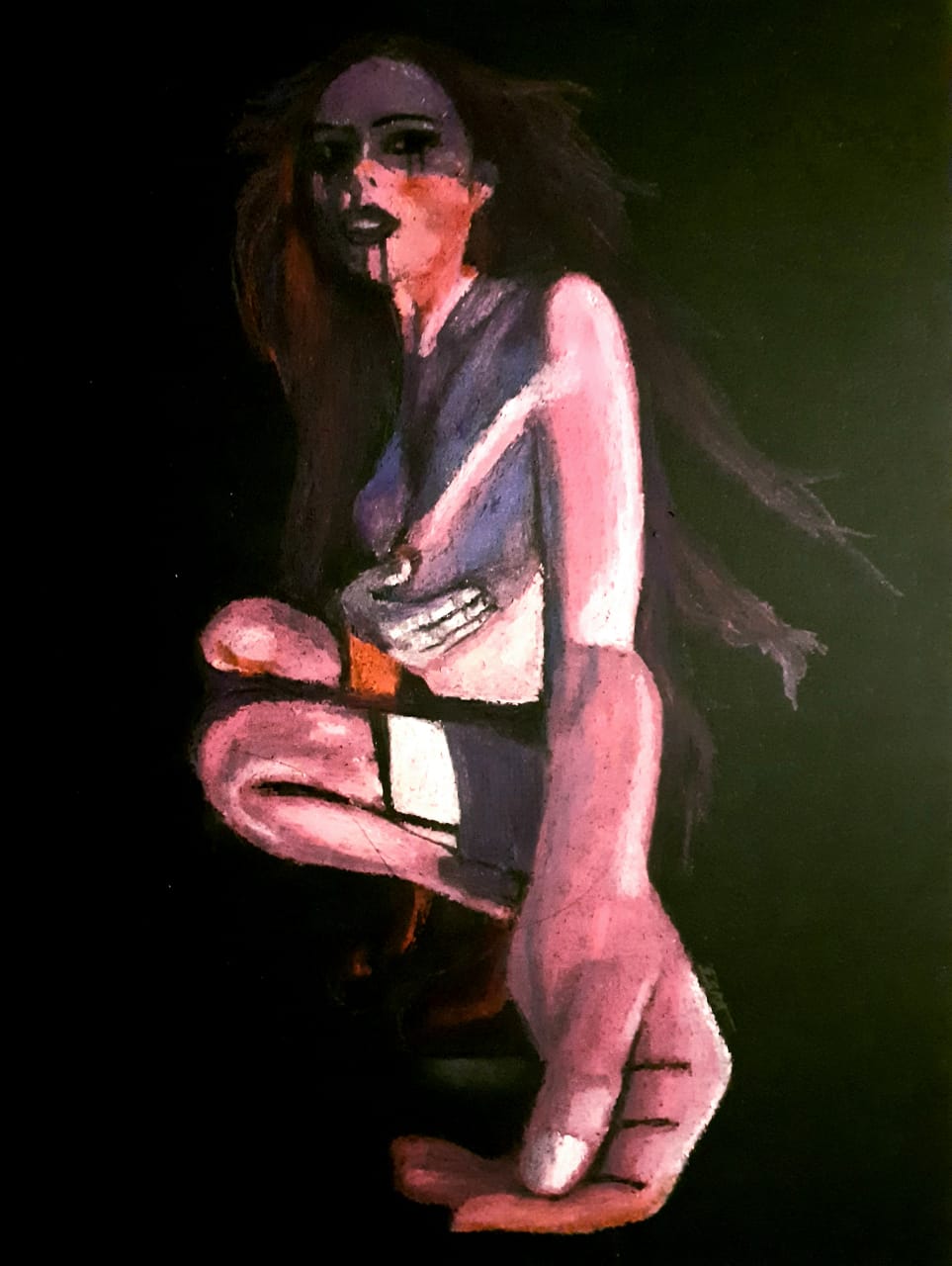 Dibujo de mujer en crayón sobre papel negro.