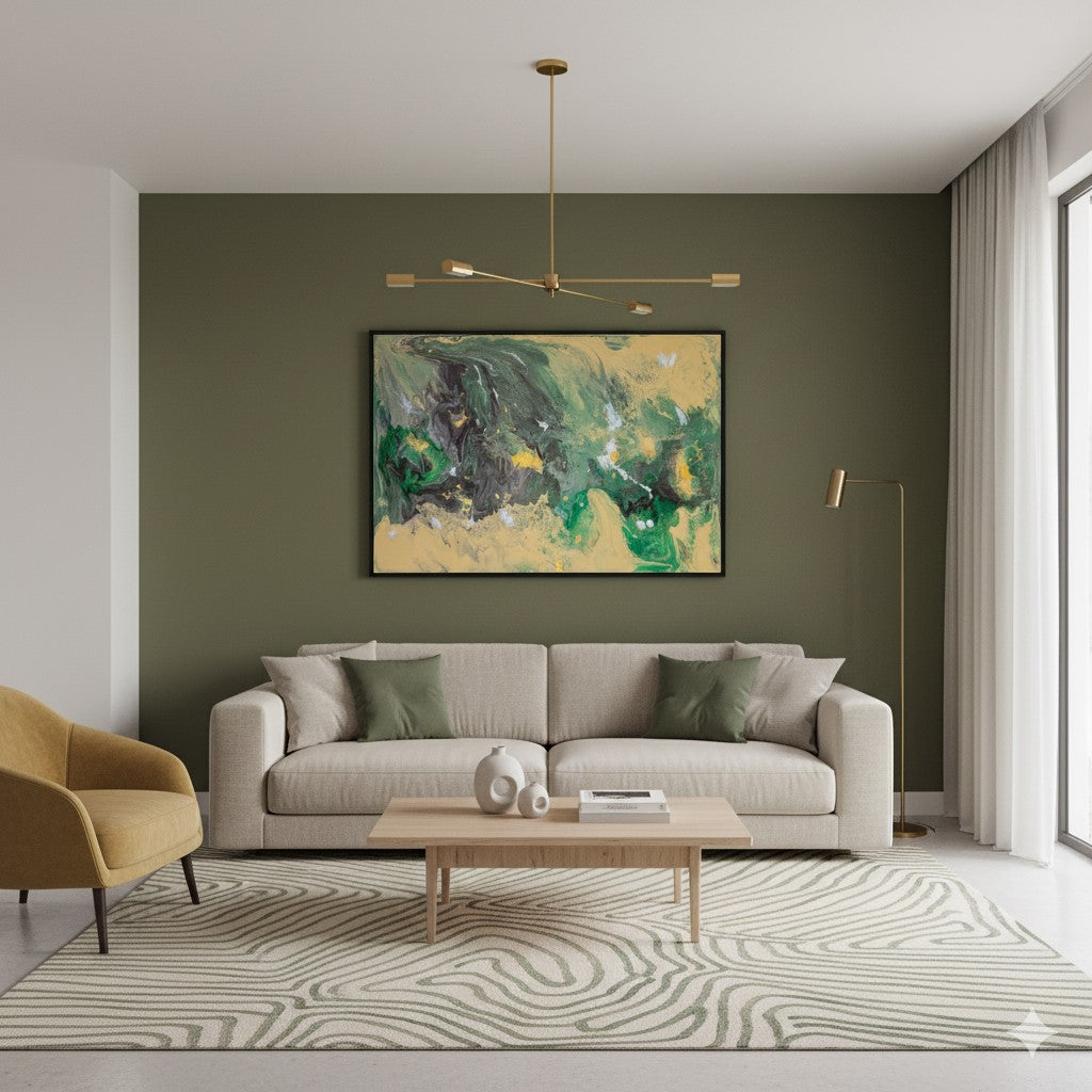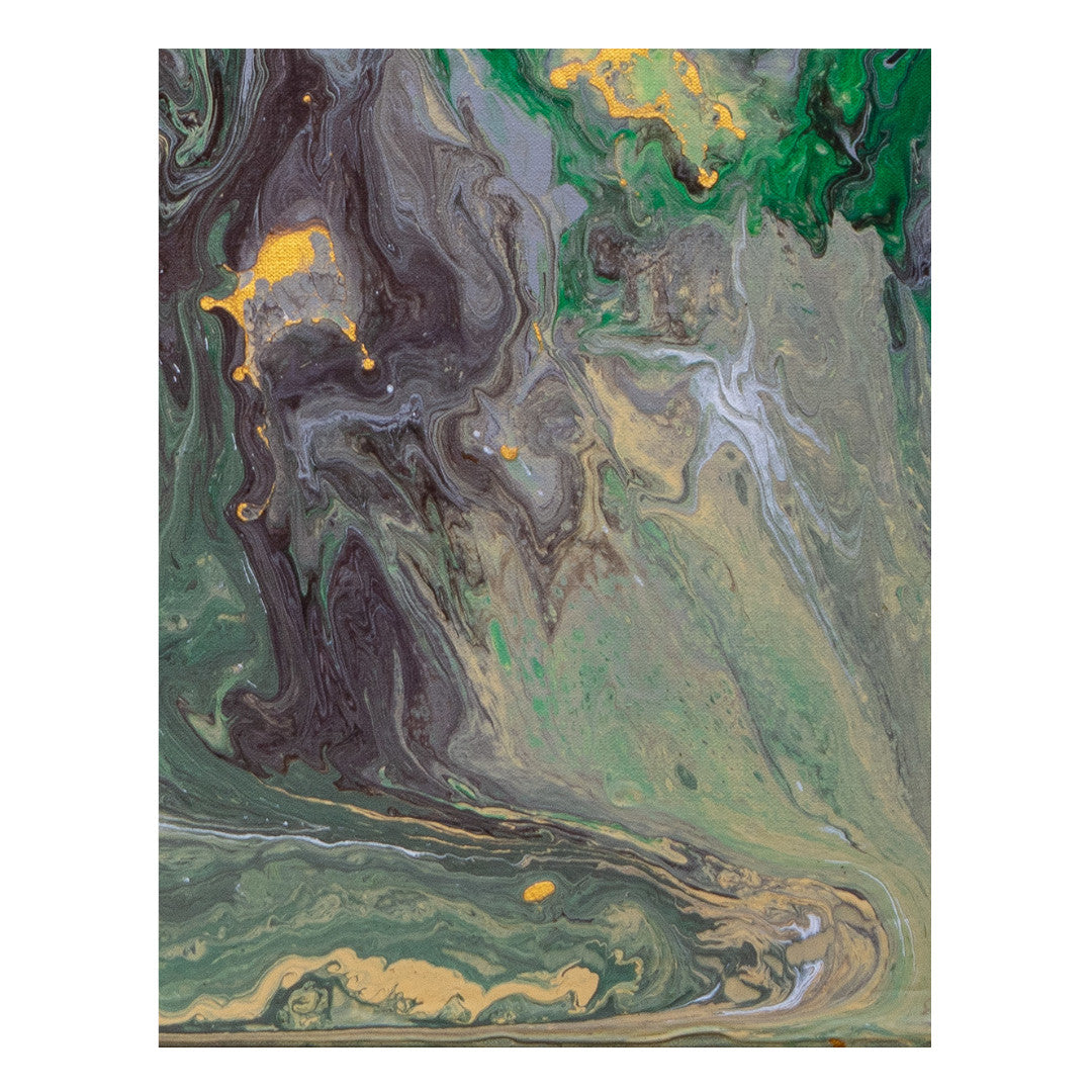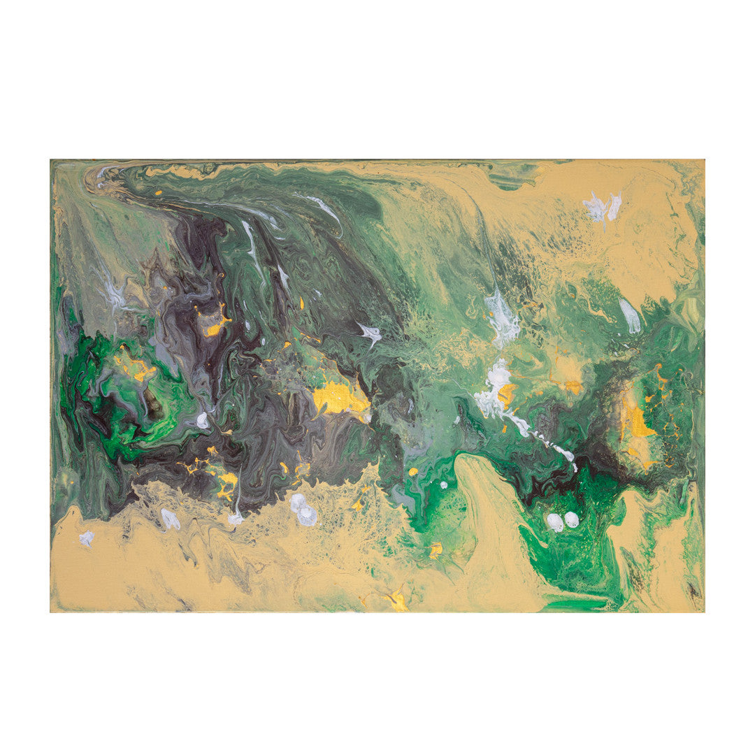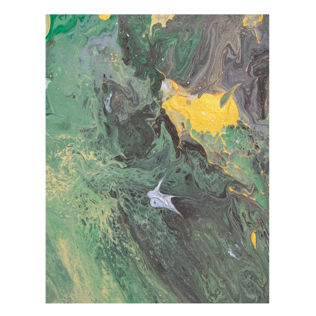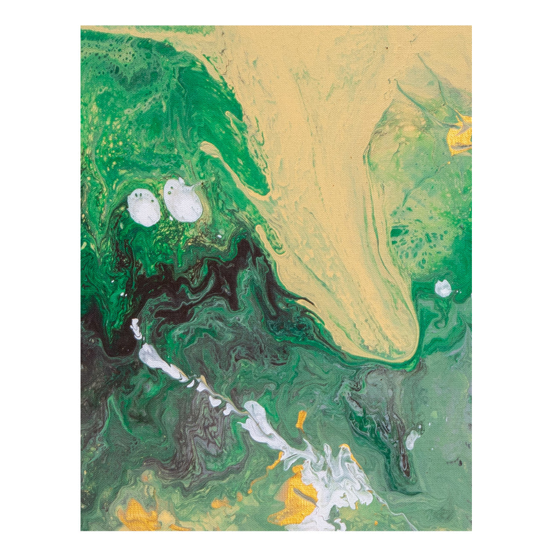 Abstract art on a cotton canvas frame using brushstrokes, splattering, and Dutch pouring techniques.
