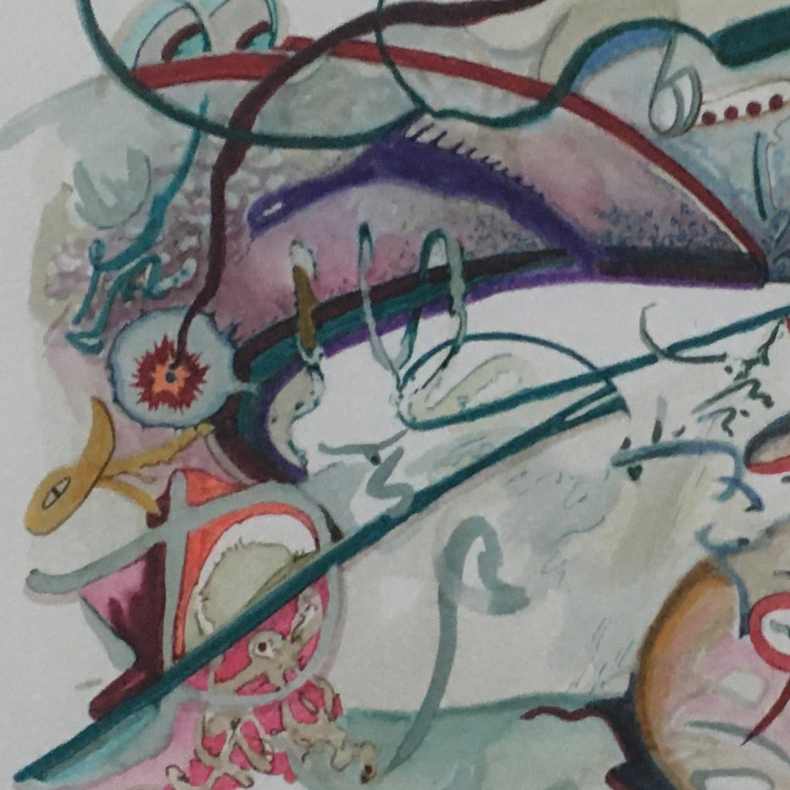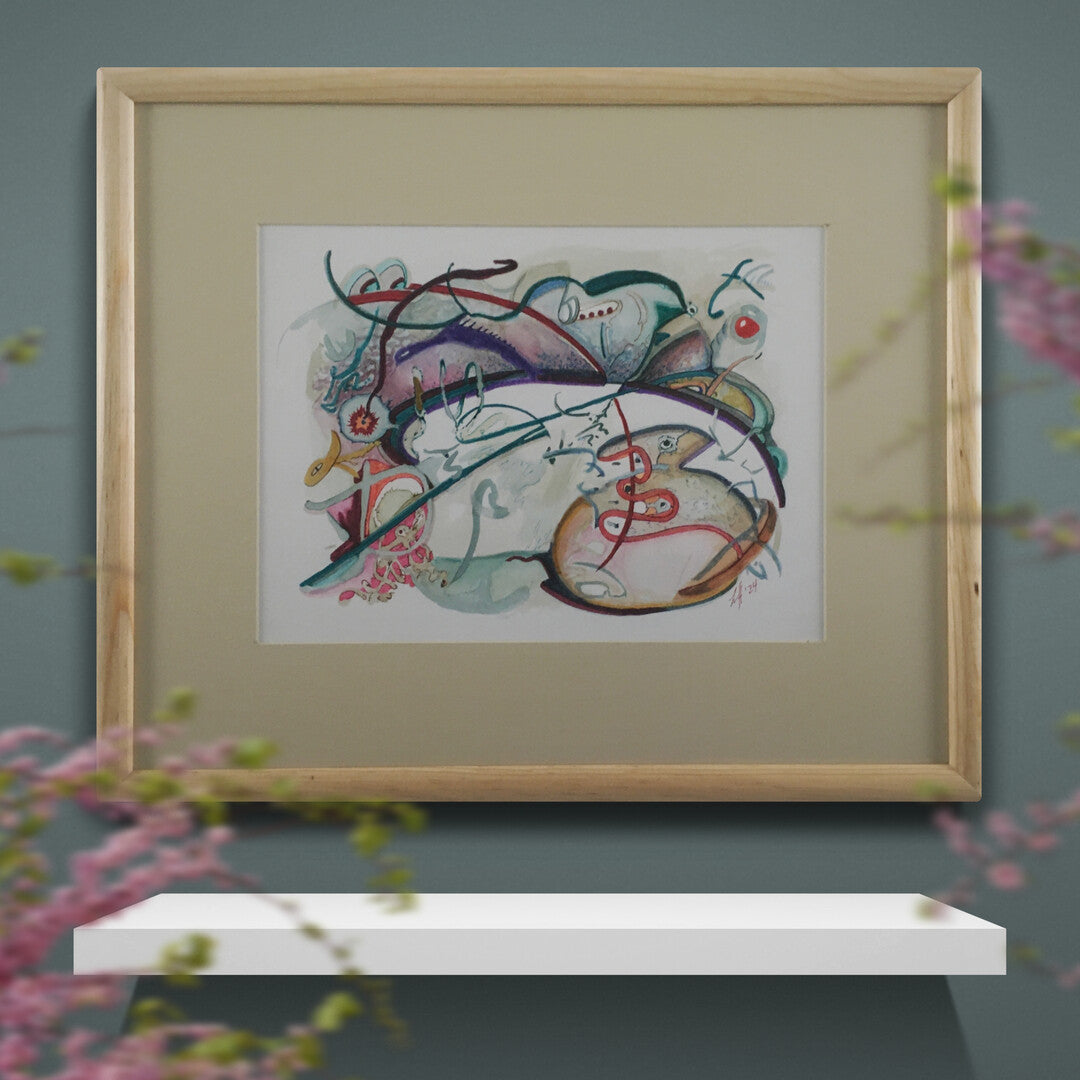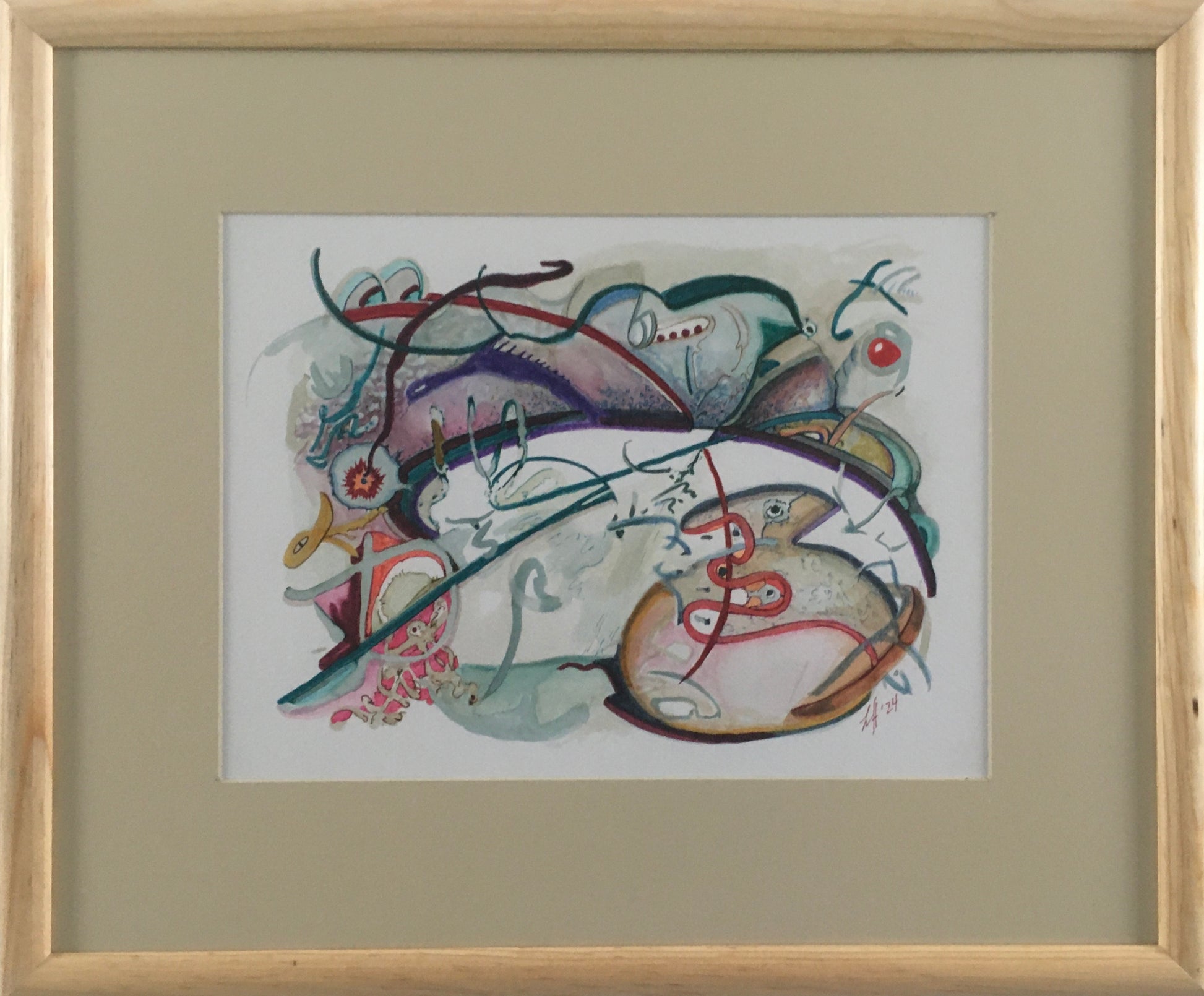 The piece is framed with a matte. I work in a "chaos to order and back again" process which gives it its abstract quality tightened to a more formal surreal feeling.