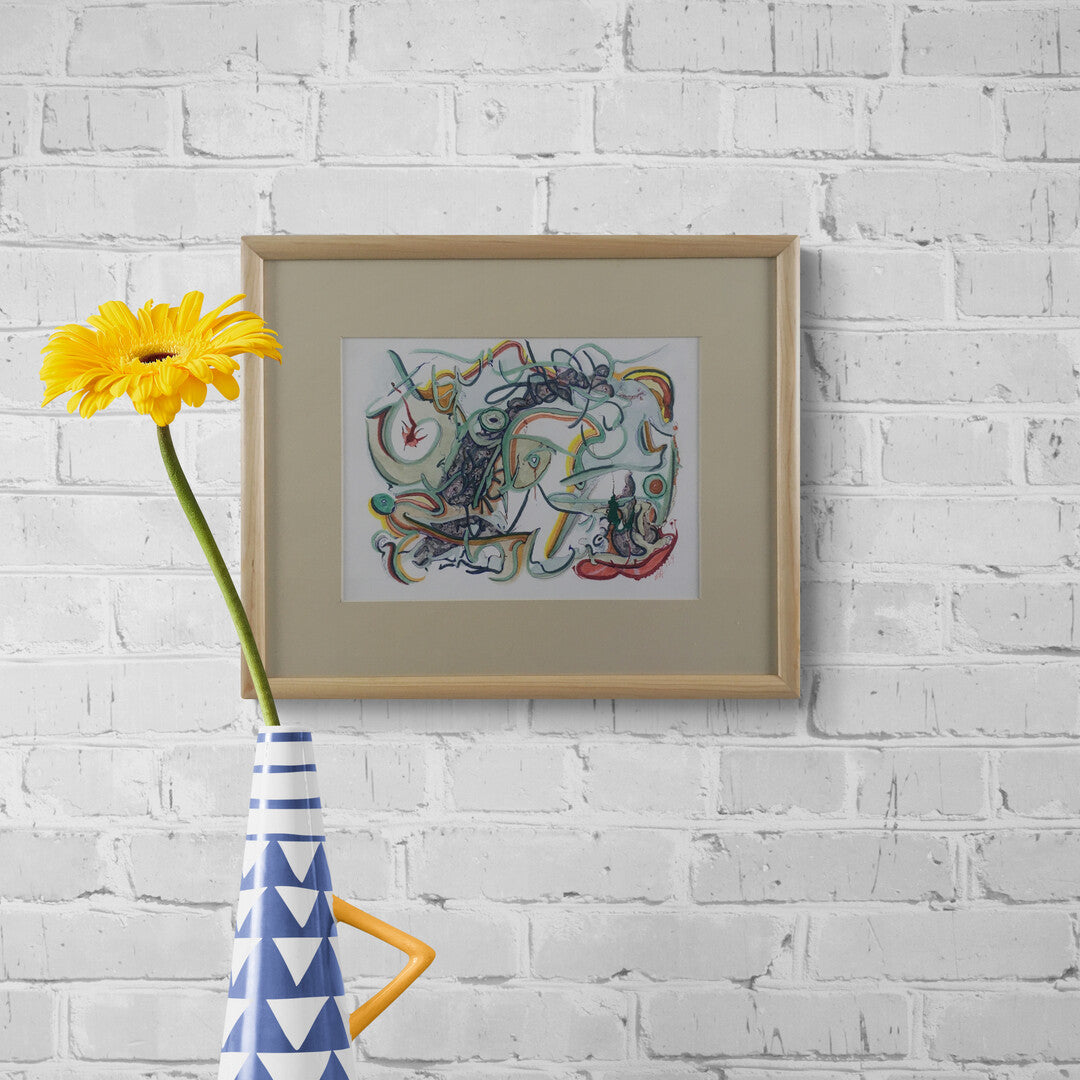 The piece is framed with a matte. I work in a "chaos to order and back again" process which gives it its abstract quality tightened to a more formal surreal feeling.