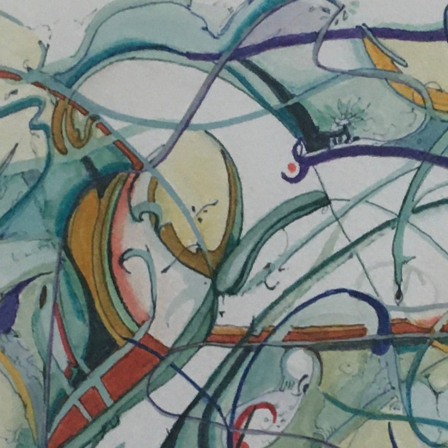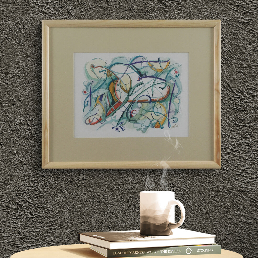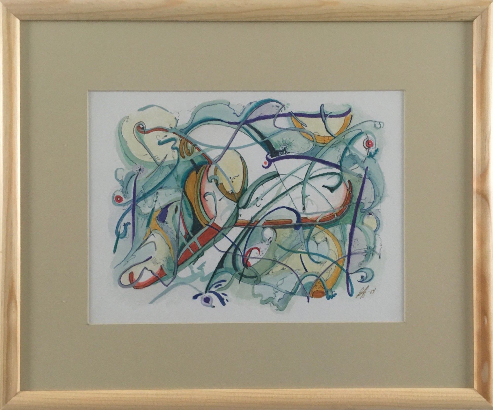 The piece is framed with a matte. I work in a "chaos to order and back again" process which gives it its abstract quality tightened to a more formal surreal feeling.