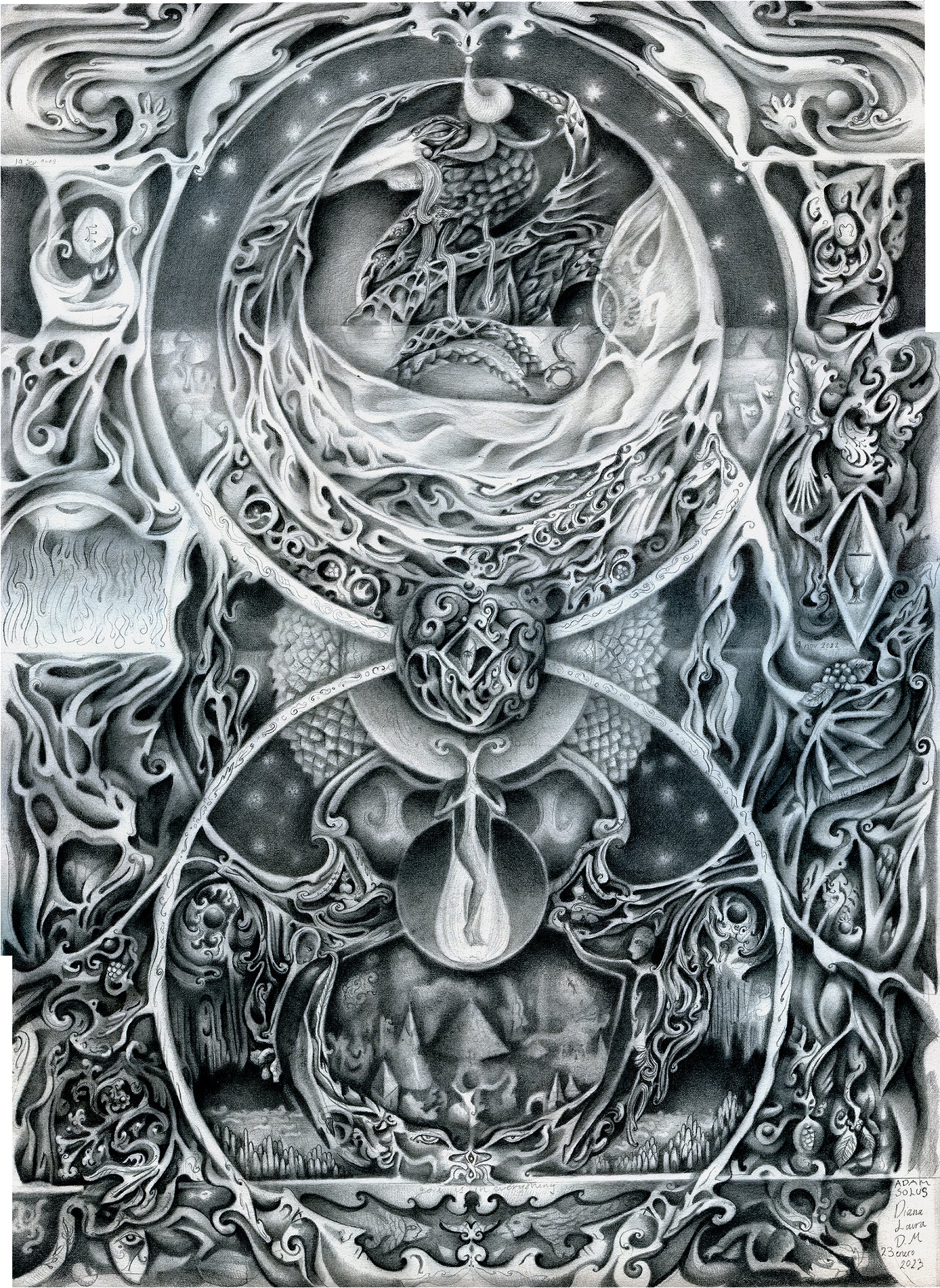 "Adam Solus" es una obra que retrata un mundo imaginario, donde los humanos éramos de una sustancia etérea (astral) y nos manteníamos enlazados con nuestro origen divino, los animales y plantas, de igual manera, eran consciencias elementales que alegremente participaban del aprendizaje que recibían de su propia divinidad.Los pilares que enmarcan la obra representan lo Material y Espiritual, principios necesarios para que la creación pueda ocurrir. El trabajo de esta obra tomó alrededor de 4 meses
