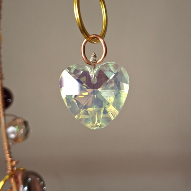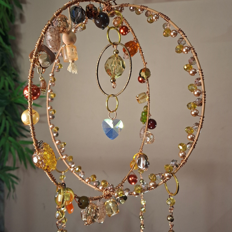 Adorno colgante hecho con 2 aros metálicos dorados adornado con figuras acrílicas en tonos cafés y cuentitas de cristal. Al centro luce un dije de cristal en forma de corazón que lo sujetan 3 aritos dorados.