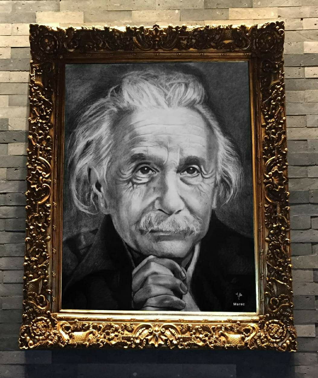 Perfil de Alber Einstein realizado a grafito sobre opalina blanca, dimensiones 21 x 29 cm enmarcado realizado a mano con cartón reciclado reforzado para una apariencia amaderada.