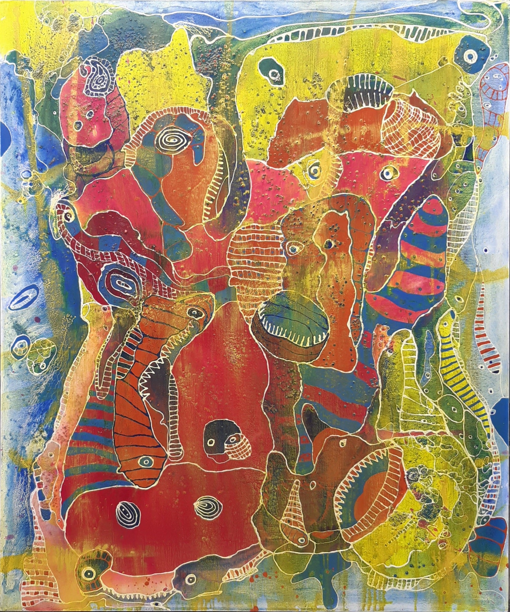Esta pintura pertenece a la serie Alebrijes, dedicada a esas figuras imaginarias que forman parte de la artesanía y el folklore mexicanos.