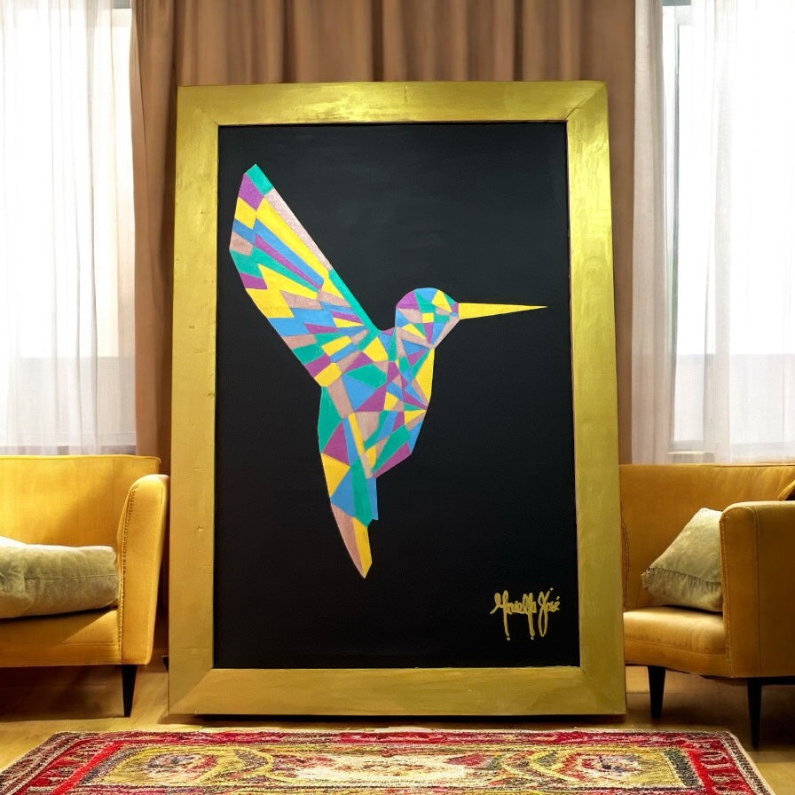 Pintura de acrílica metálica en lienzo con marco de MDF 75 de base por 1.05 de altura. Este colibrí nos trae un mensaje que nos inspira a apreciar los matices de la vida y a sentir felicidad simplemente por el ser.