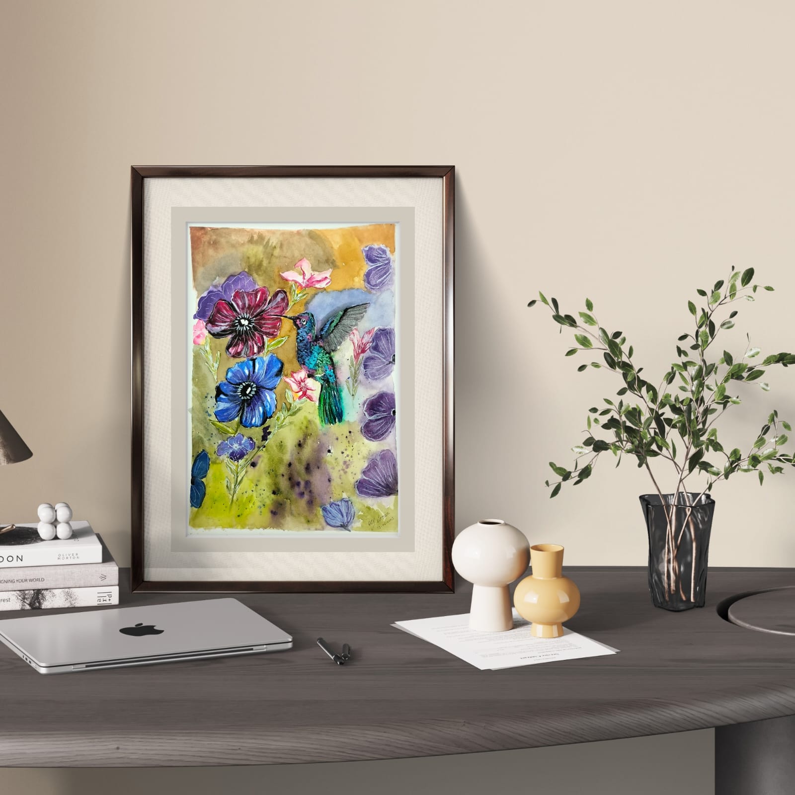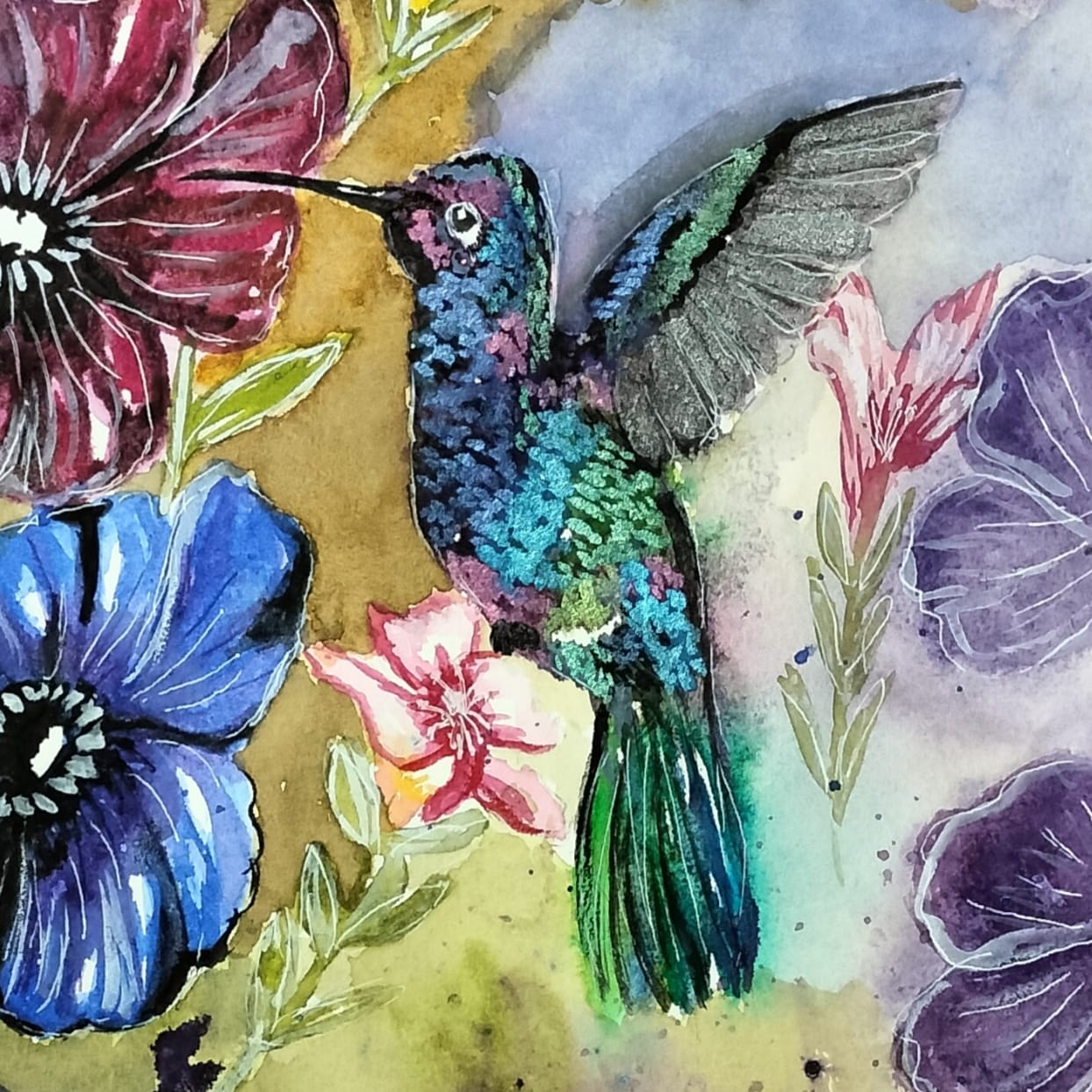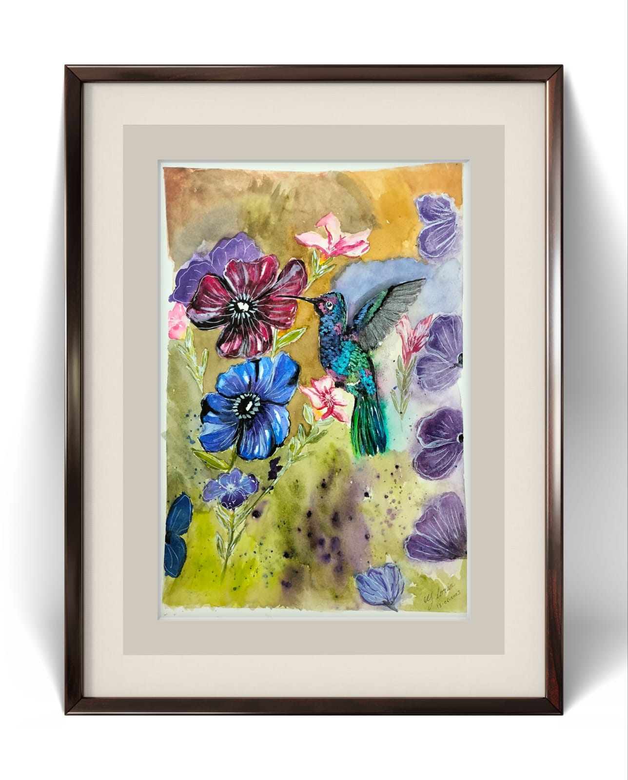 “Aleteo silencioso” captura un instante de quietud vibrante: el colibrí, símbolo de la fragilidad luminosa, se posa entre flores como si el tiempo se detuviera. La obra evoca esa pausa sutil entre el impulso y la calma, donde el alma respira y florece en silencio.