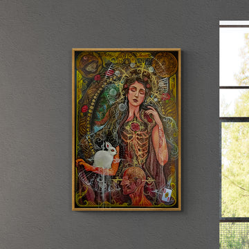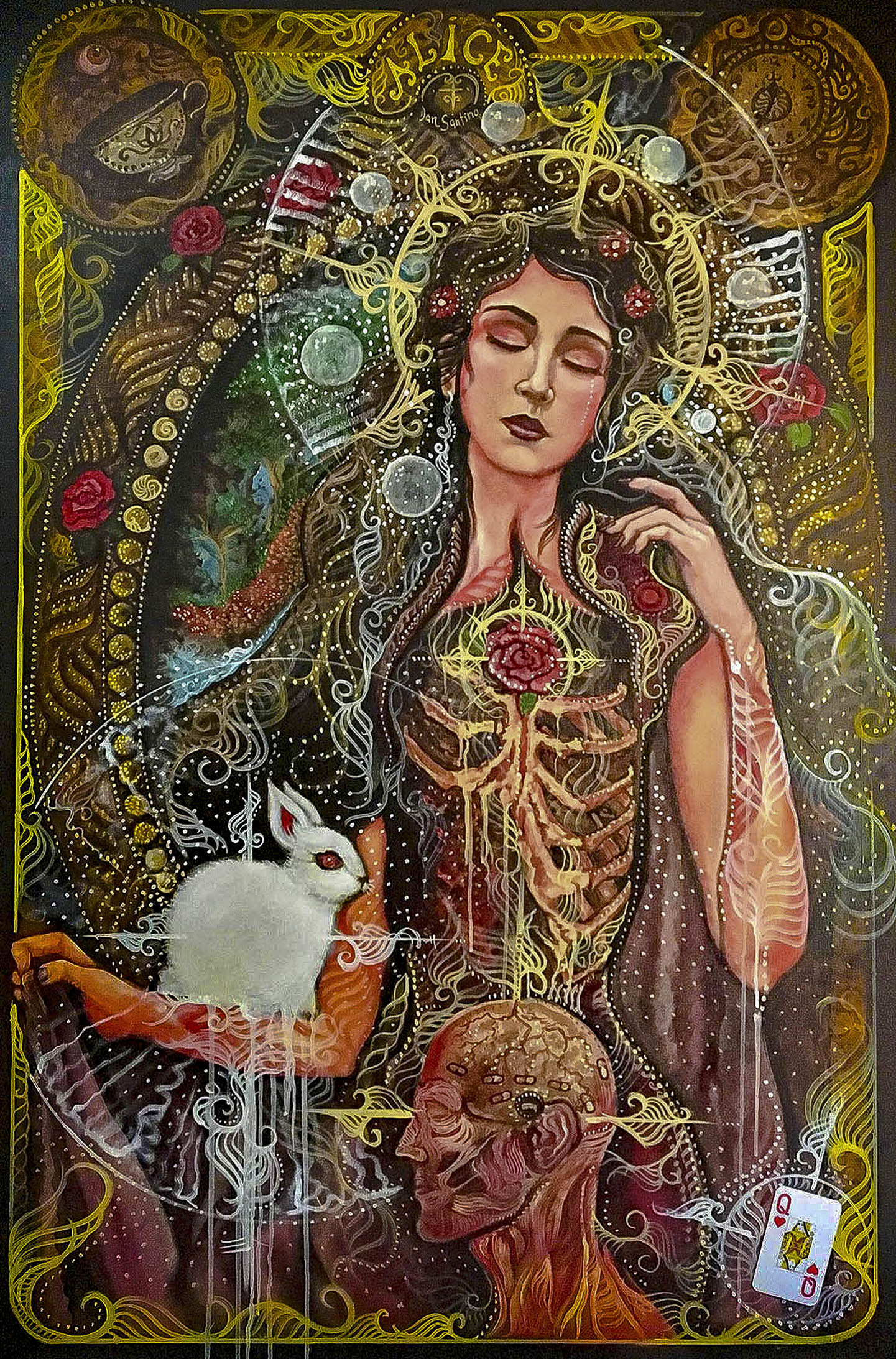 Obra inspirada en Alicia en el país de las maravillas. La simbología de esta pieza es muy poderosa, la flor que se encuentra en su pecho es una metáfora del corazón al cual si no cuidas y riegas con arte y emociones se puede marchitar y perder motivación.