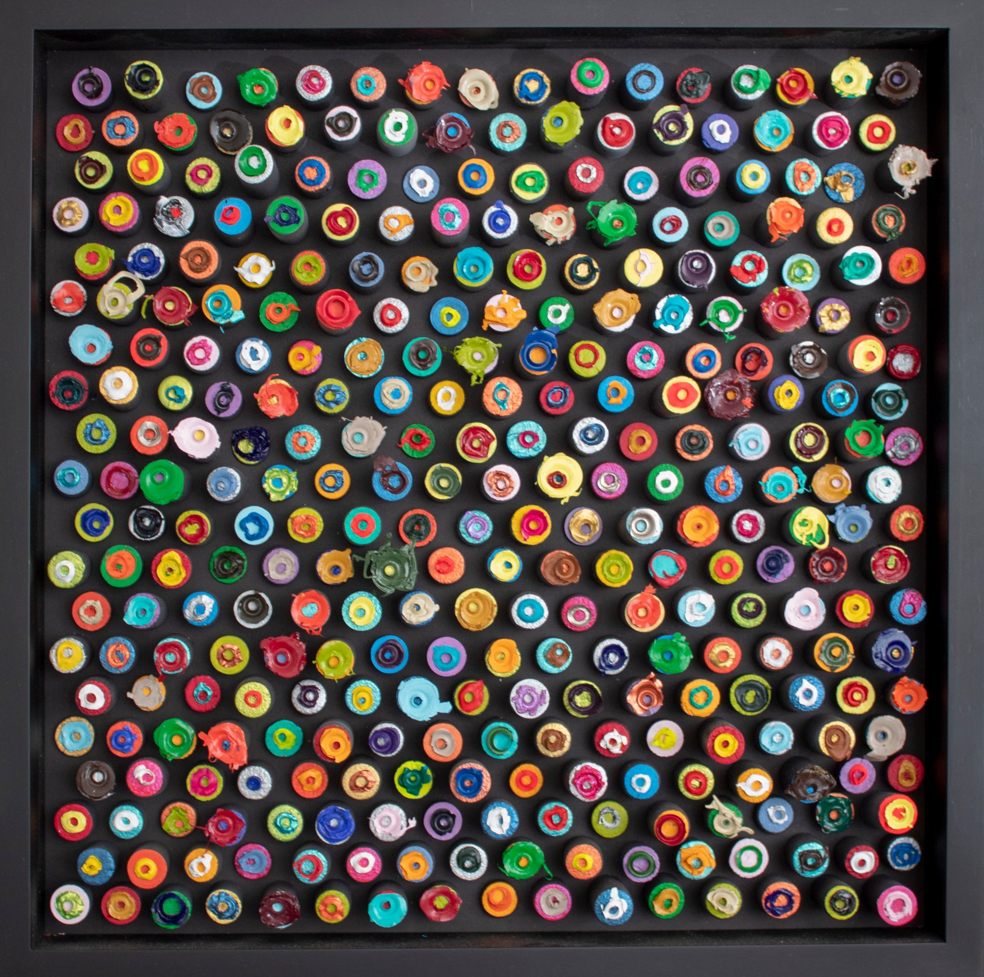 Este espectacular ensamblaje artístico o collage tridimensional está conformado por numerosas piezas cilíndricas de colores vibrantes, cuidadosamente dispuestas sobre una superficie plana y negra, encajonadas en una caja veneciana. Cada pieza tiene un largo diferente, por lo que se elevan otorgando dinamismo visual al conjunto.