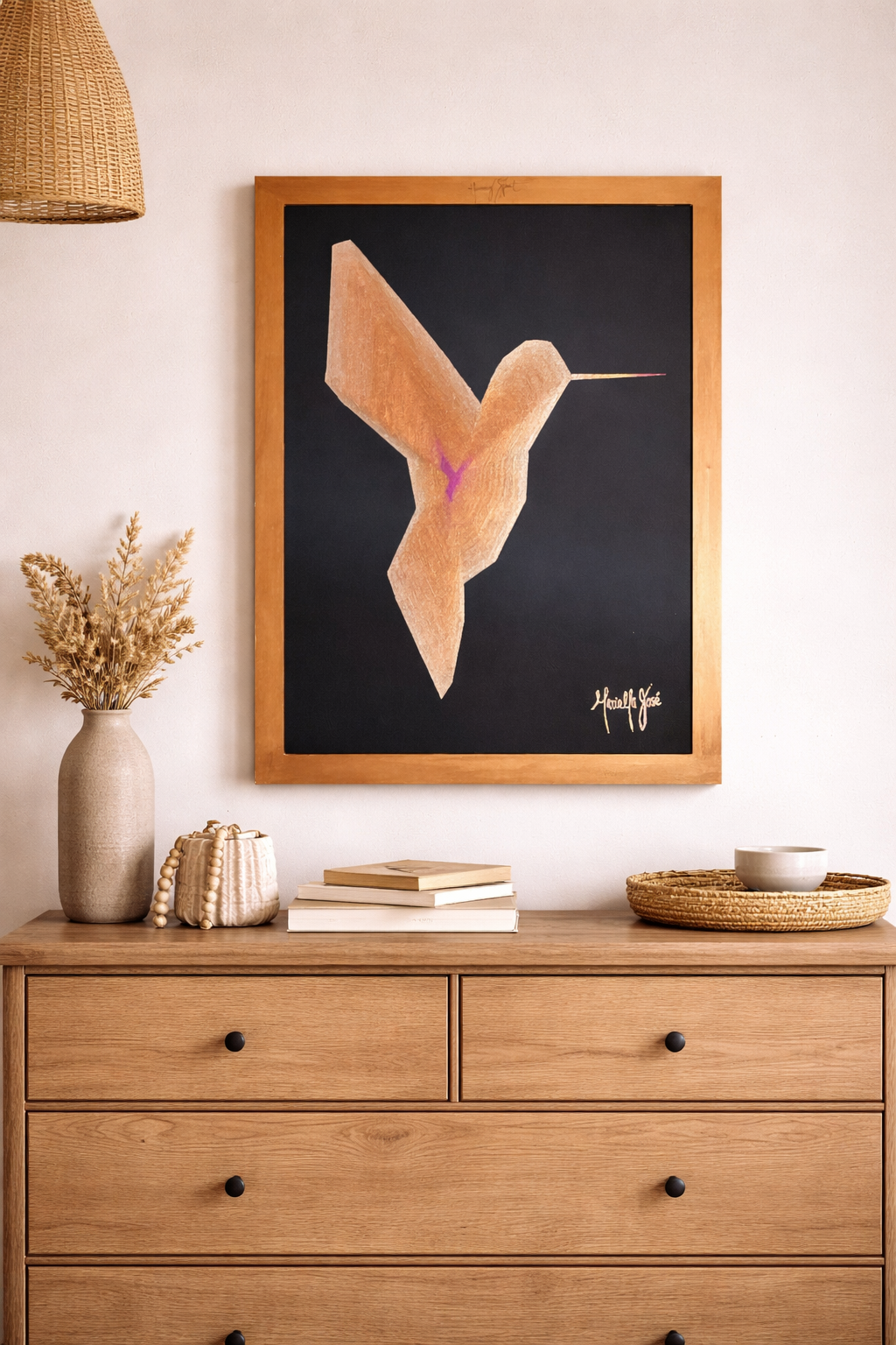Pintura en acrílica metálica sobre lienzo y marco de MDF 56 x 76 Este colibrí entrega un mensaje que nos inspira a reconocer la esencia del alma y dejarla expresarse.