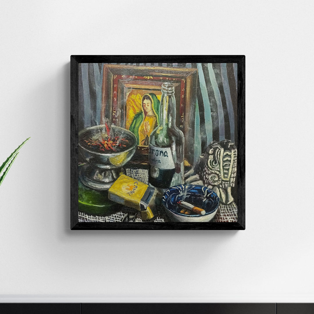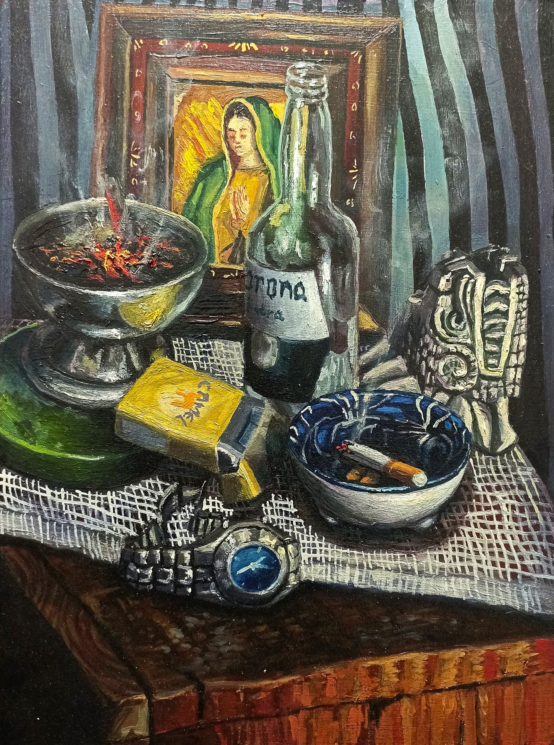 Esta pieza retoma objetos cotidianos e iconografías religiosas de identidad Mexicana y sus raíces principalmente, para hablarnos sobre la divinidad y el placer terrenal como cosas de nuestra condición.