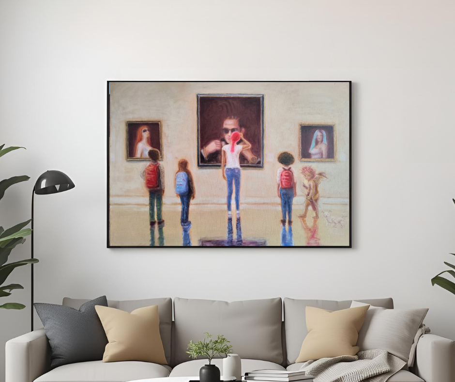 La tecnica de temple y oleo, de magro a graso, (técnica antigua) perfeccionada por los grandes maestros del renacimiento, descubre la profundidad, la luminosidad y la durabilidad de la técnica pictorica mas venerada de la historia del arte. El museo es un foro, este escena captura la atención y el dialogo entre la historia del arte de la cultura pop.