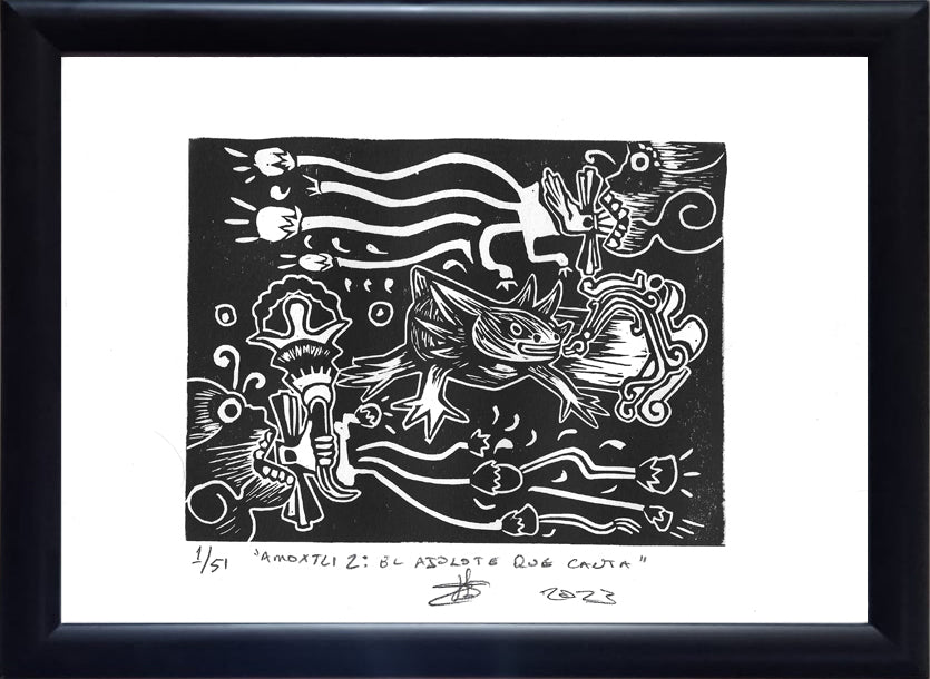 "Amoxtli 2: el ajolote que canta" es una linografía sobre papel que pertenece a la serie "México Mágico", donde el artista Hernández Soto explora símbolos culturales profundamente arraigados en la identidad mexicana. En esta obra, el ajolote, una criatura emblemática de la fauna endémica, es representado no solo como un ser biológico, sino como una figura cargada de mitología y simbolismo.