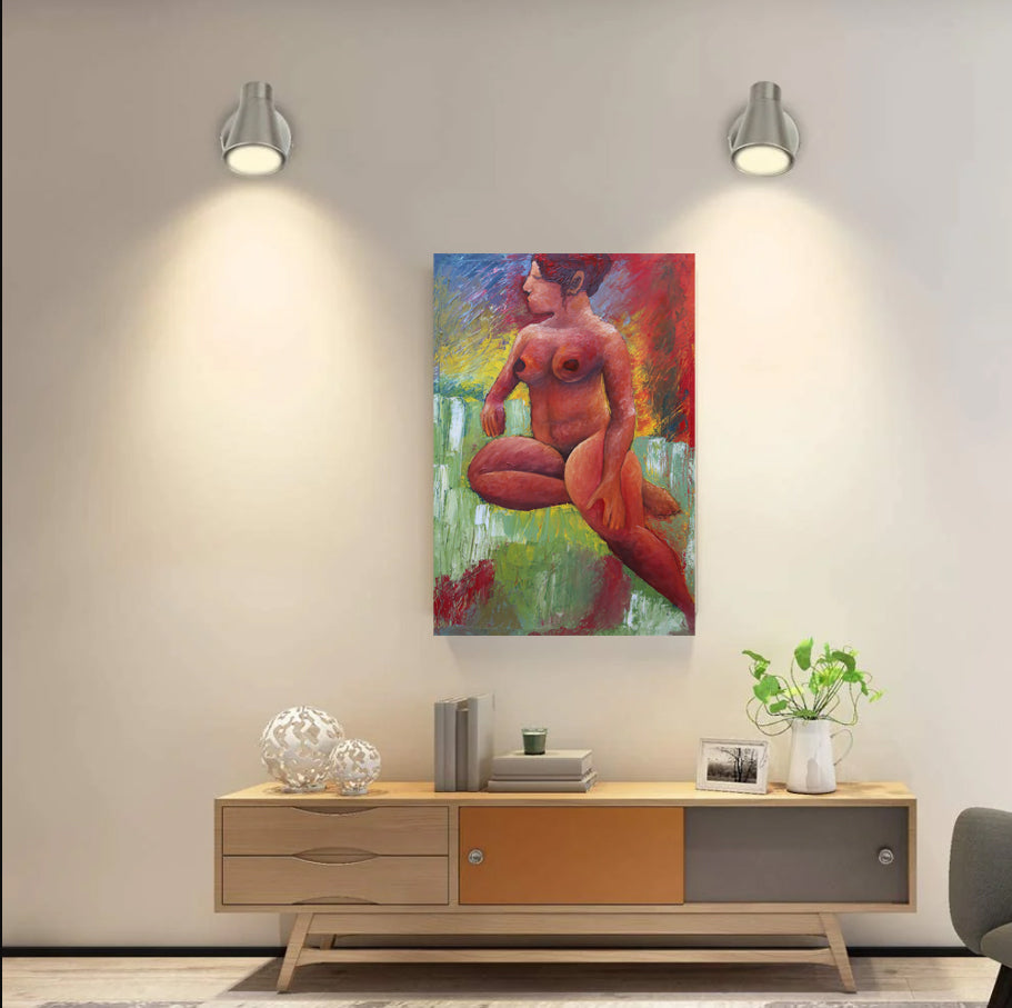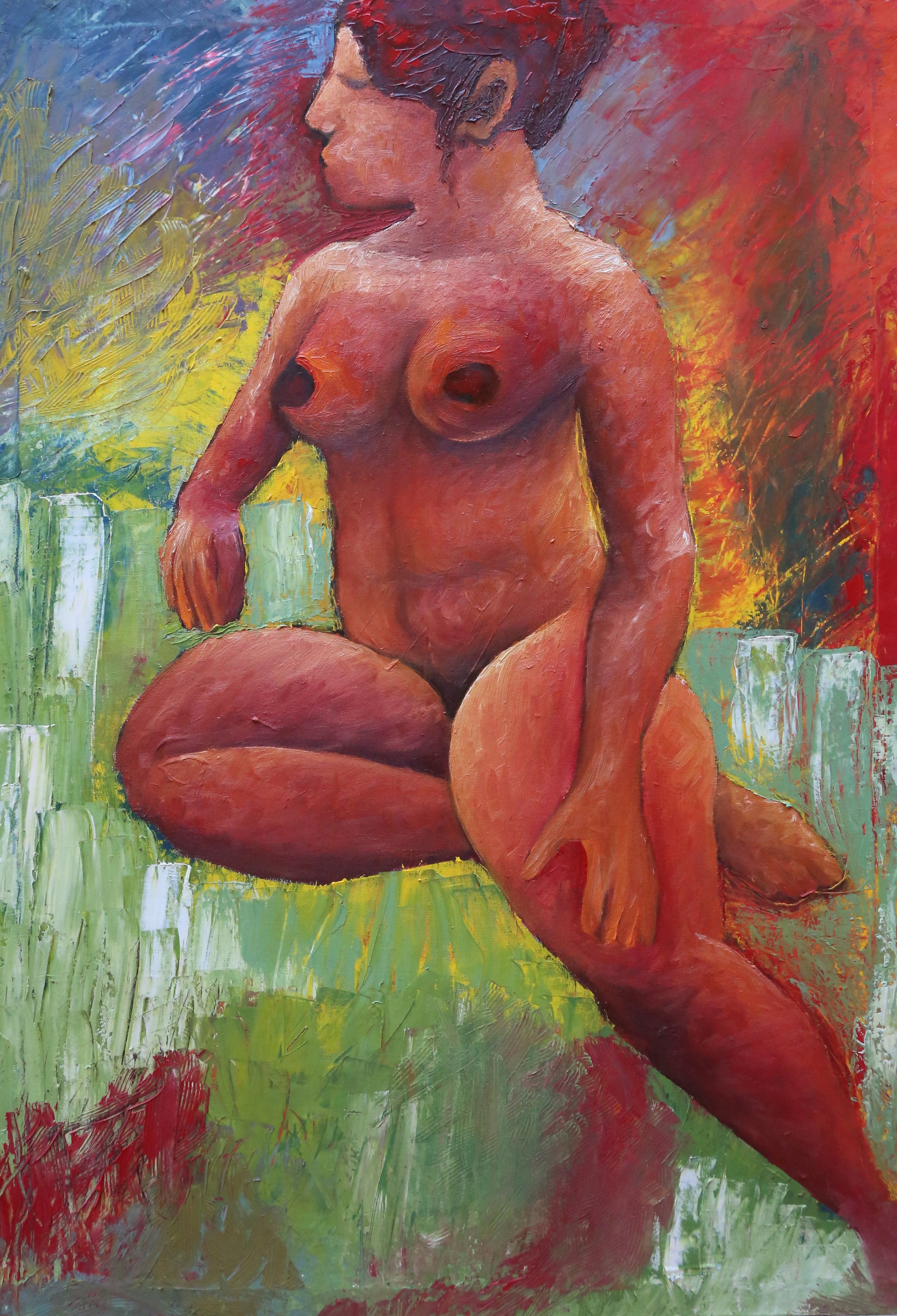 "Ángel de fuego" es una cautivadora obra realizada en óleo sobre tela, con dimensiones de 74 x 49.5 cm. La pieza presenta colores vívidos y cálidos que contrastan con un fondo de tonalidades frías. En el centro de la composición, una mujer desnuda está sentada casi de frente, con el cabello recogido, el brazo derecho apoyado sobre piedras blancas y frías, y el izquierdo descansando en su pierna. Su cabeza gira ligeramente hacia la derecha, transmitiendo una actitud de indiferencia y relajación, mientras su pose desprende una sutil seducción.