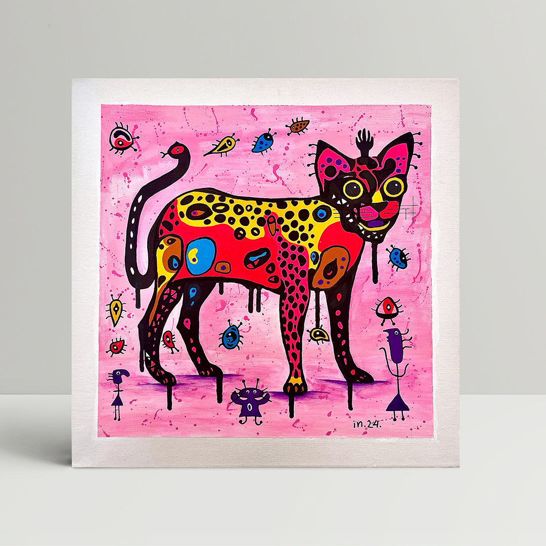 Colorido felino místico sobre fondo rosa vibrante, lleno de símbolos y criaturas que evocan magia, poder y alegría. Ideal para dinamizar cualquier espacio con arte único.