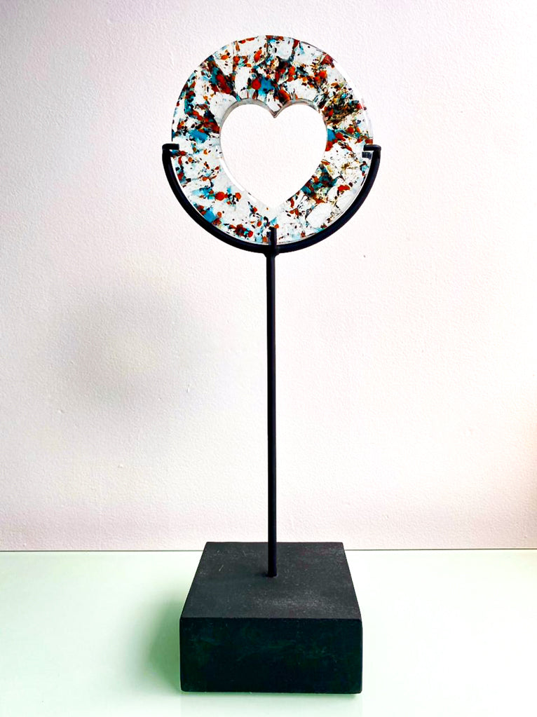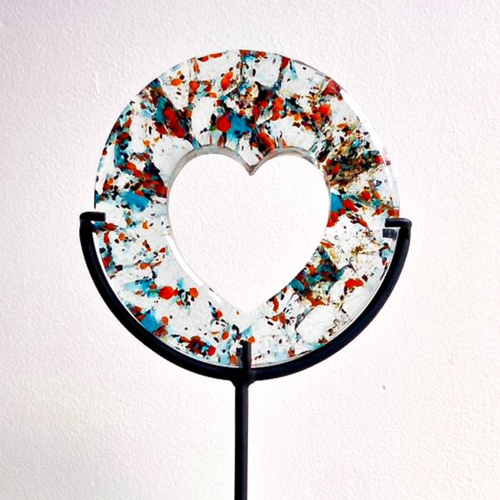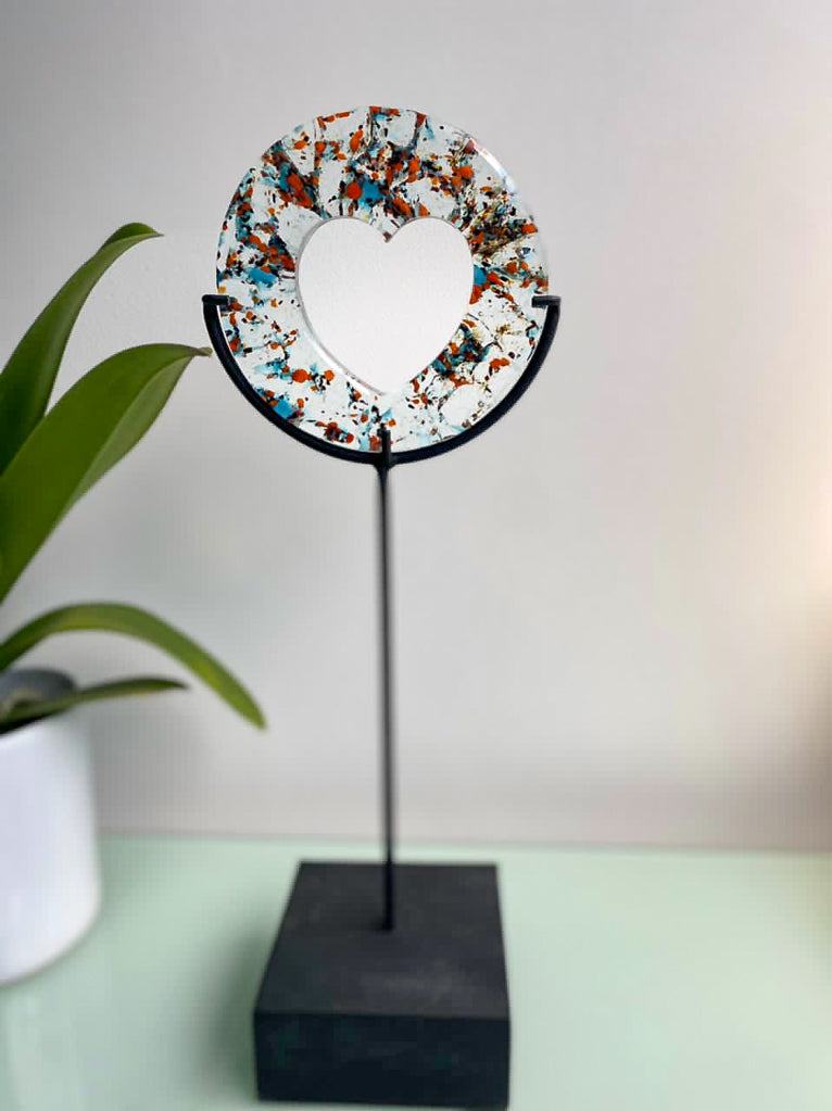 Círculo de vidrio transparente con elementos naranja, azules y negros con centro hueco en forma de corazón en base negra de metal