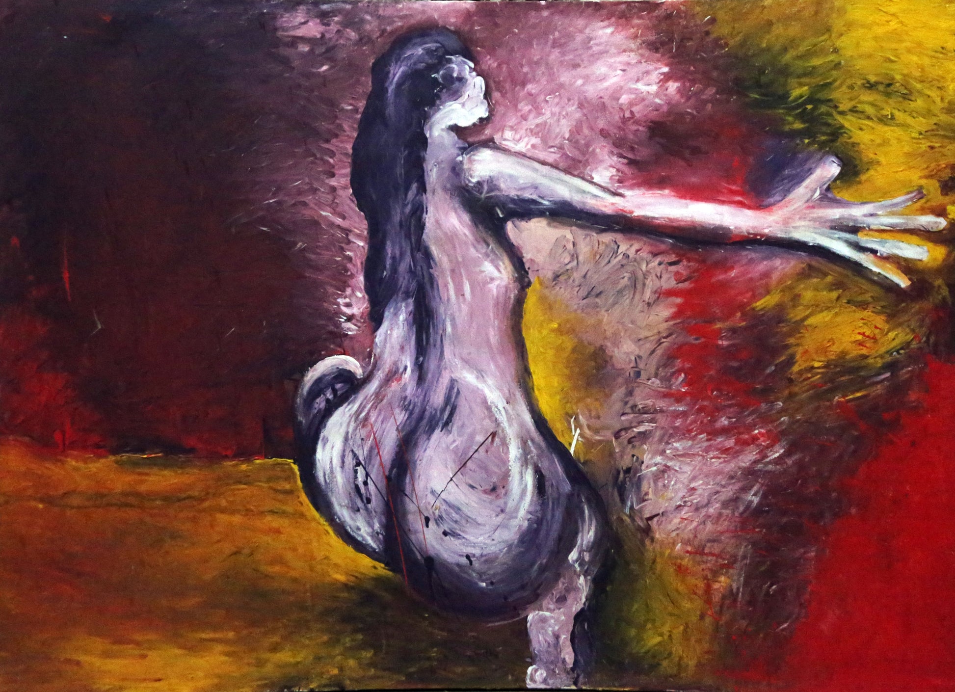 "Ante el precipicio" es una impactante pieza realizada en acrílico sobre tela, donde Jorge Hernández Soto emplea exclusivamente sus dedos para aplicar la pintura. La obra, de 64 x 125 cm, presenta colores vívidos y encendidos que emulan tonalidades de fuego. En el centro, se observa la figura de una mujer desnuda de espaldas, con la mano estirada en un gesto desesperado, simbolizando una búsqueda incompleta.