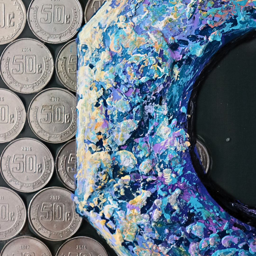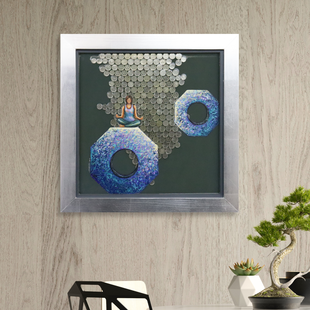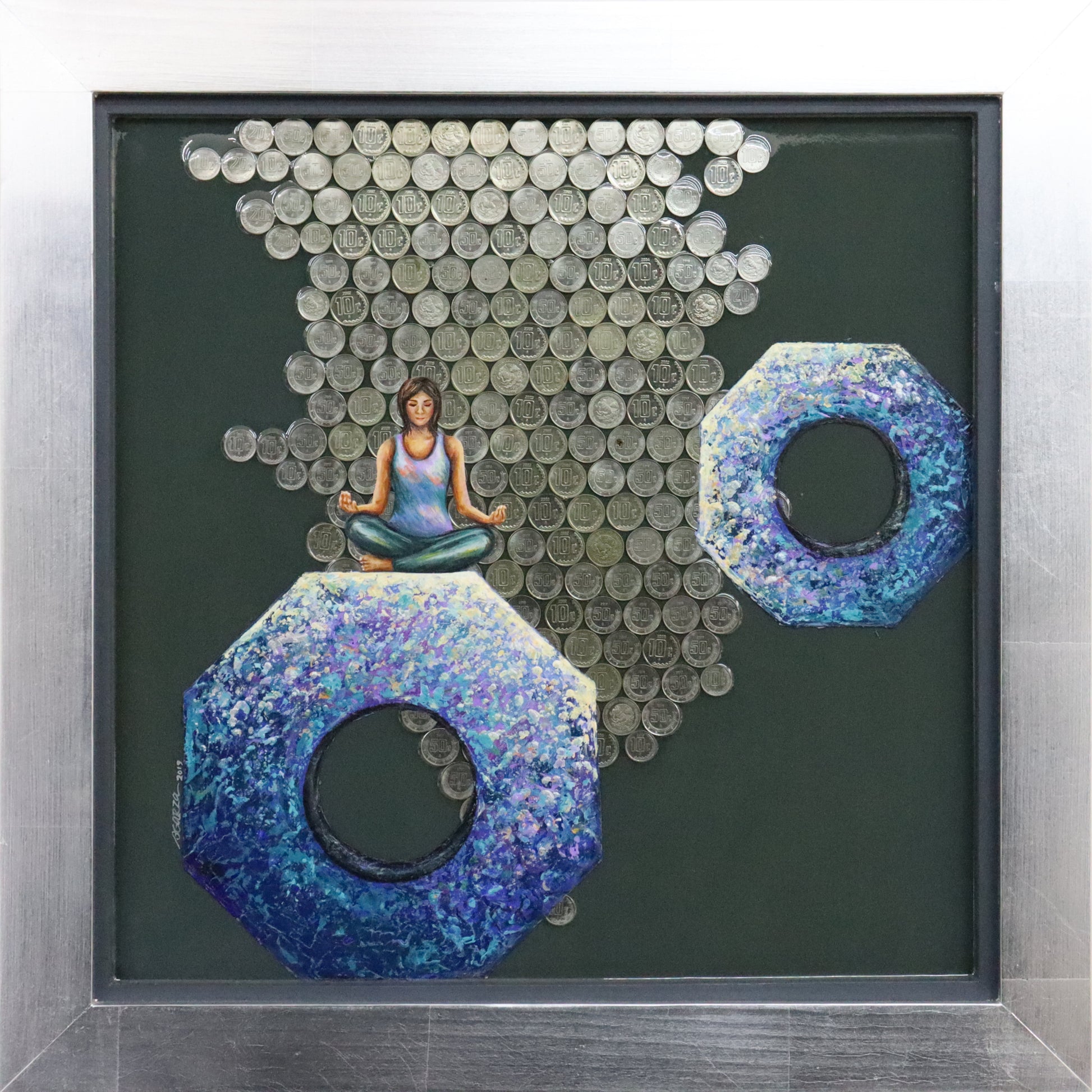 Pieza trabajada sobre lienzo de madera, pintada con óleo sobre una base de resina epóxica y con inclusión de objetos metálicos en el fondo, encapsuladas bajo la capa de resina.