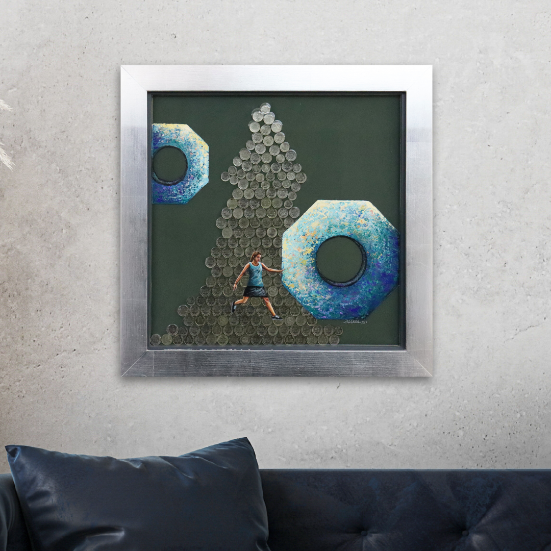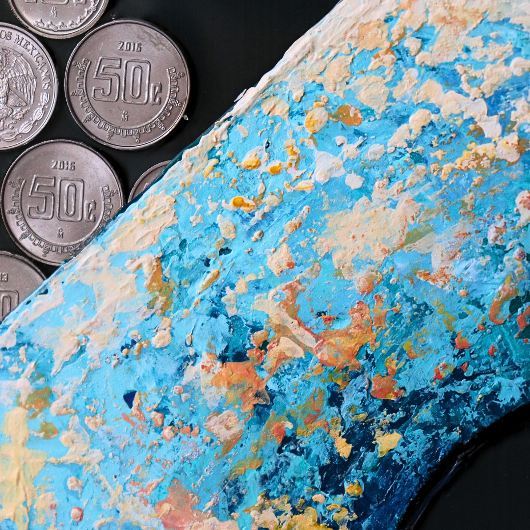 Pieza trabajada sobre lienzo de madera, pintada con óleo sobre una base de resina epóxica y con inclusión de objetos metálicos en el fondo, encapsuladas bajo la capa de resina.