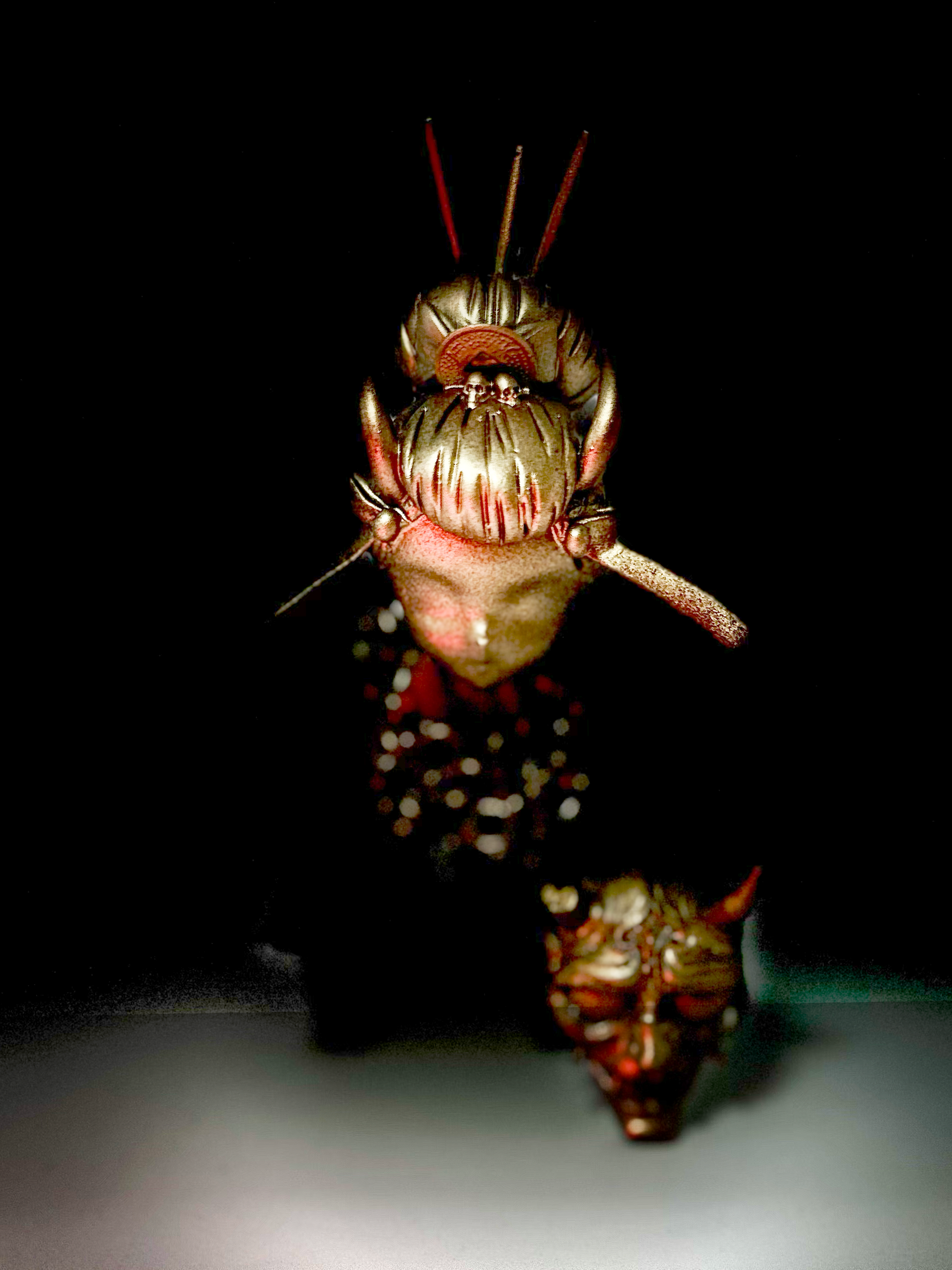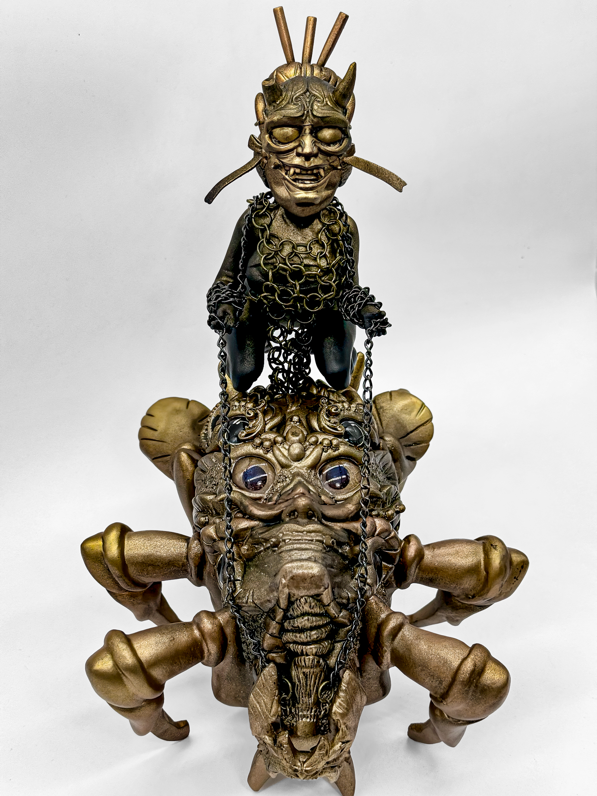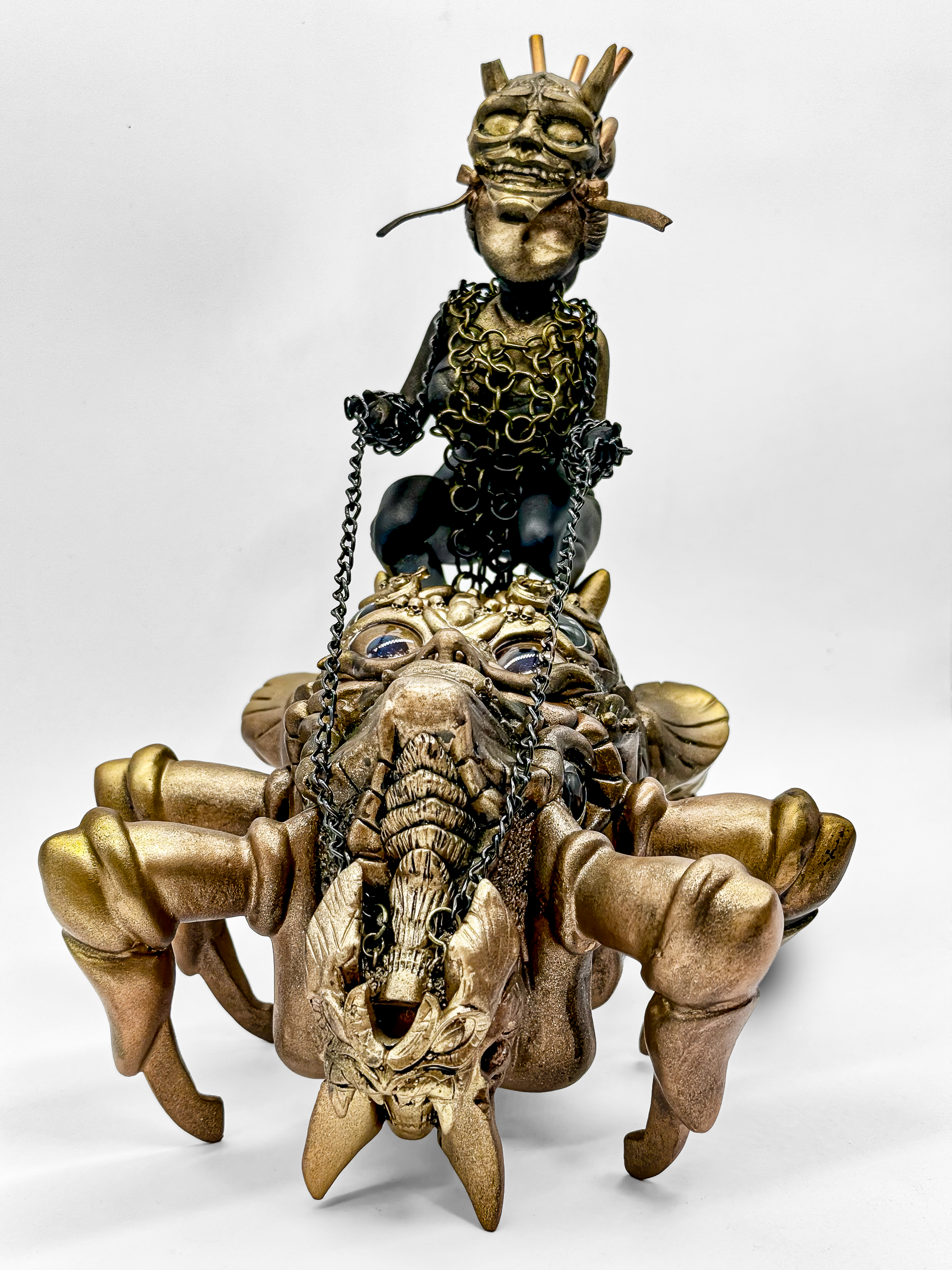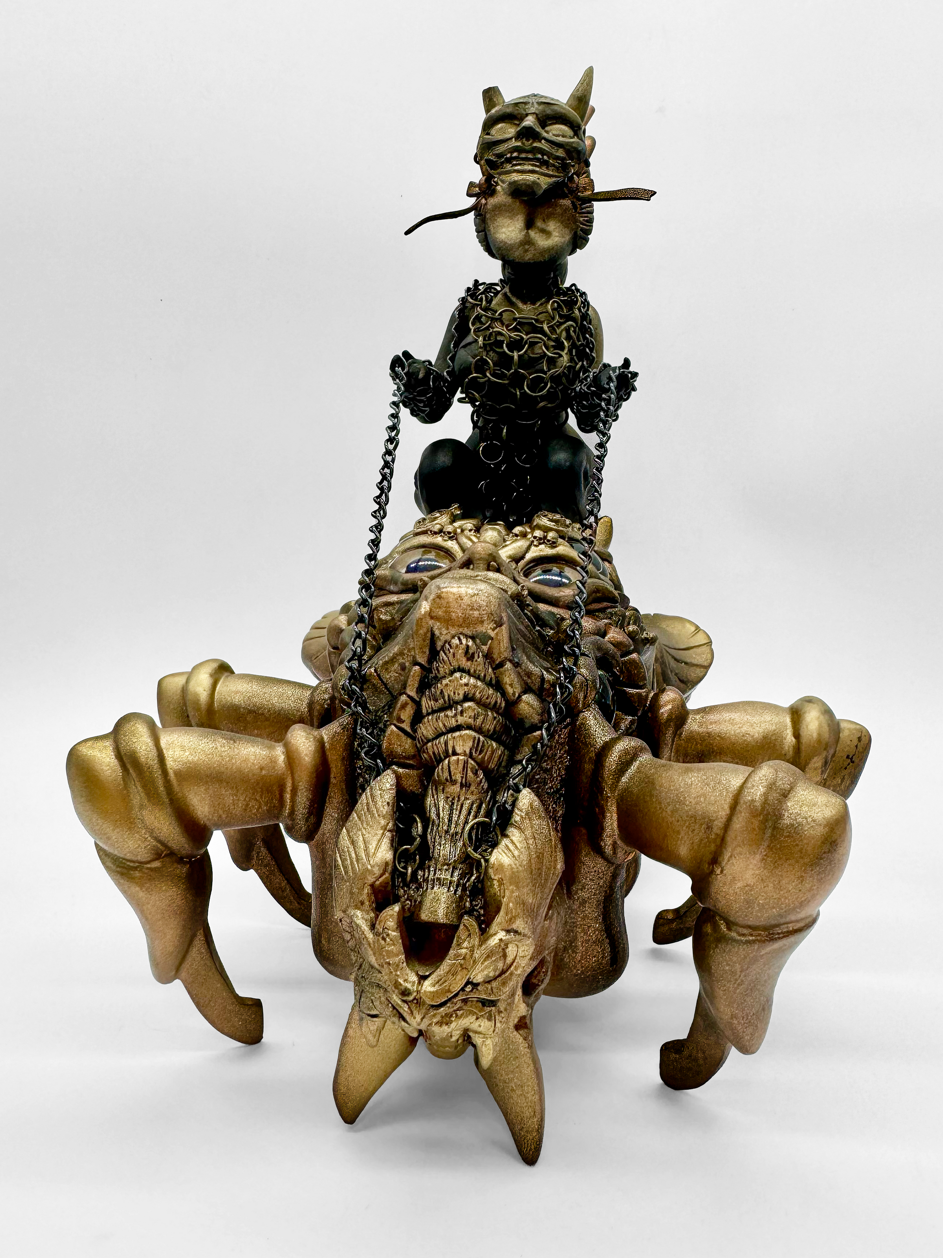 La tejedora maldita se eleva sobre una colosal araña, encarnando la tensión entre lo humano y lo monstruoso. La chica, oculta tras una máscara de demonio, simboliza el enfrentamiento con las sombras y el poder irresistible del deseo
