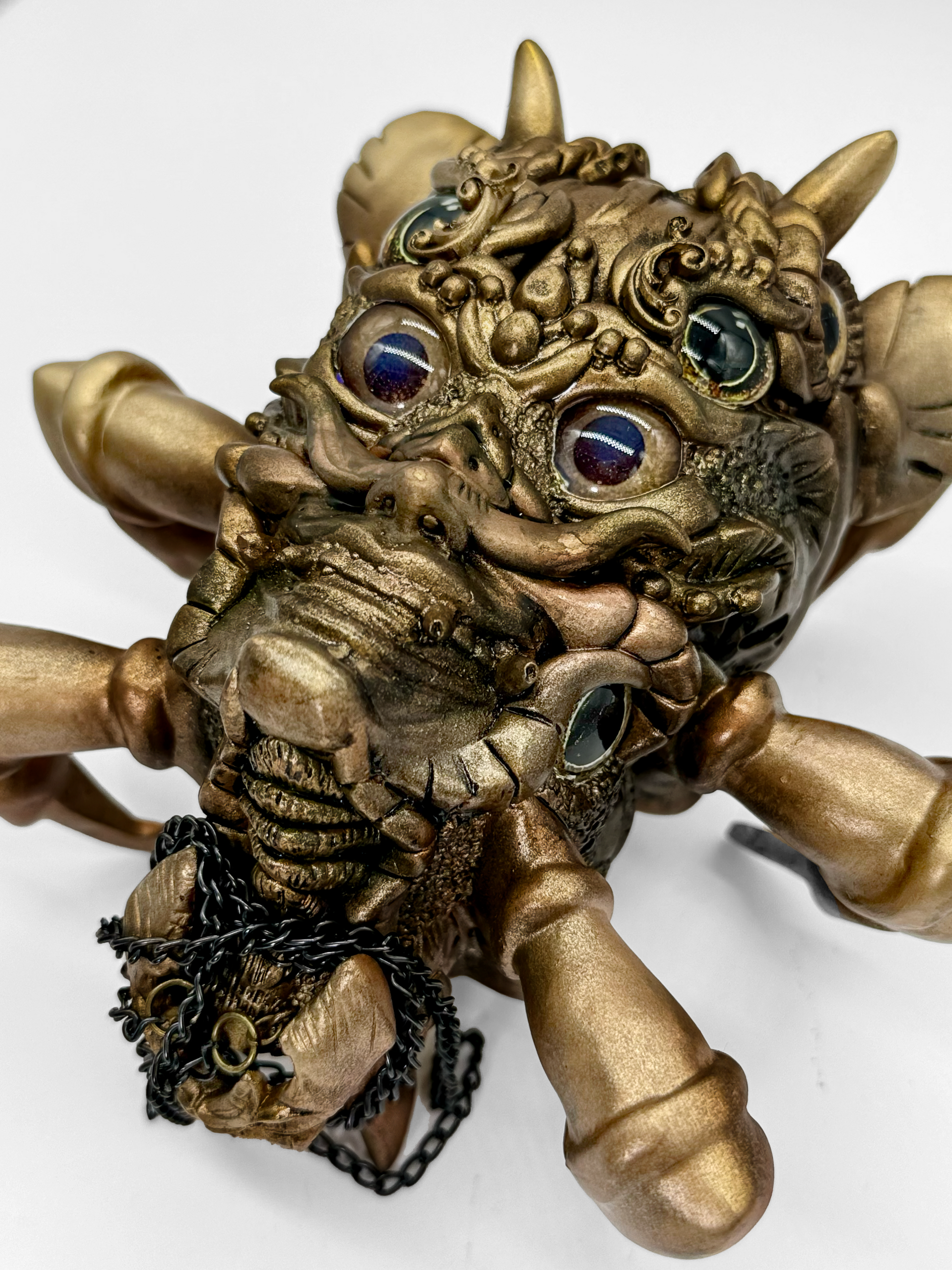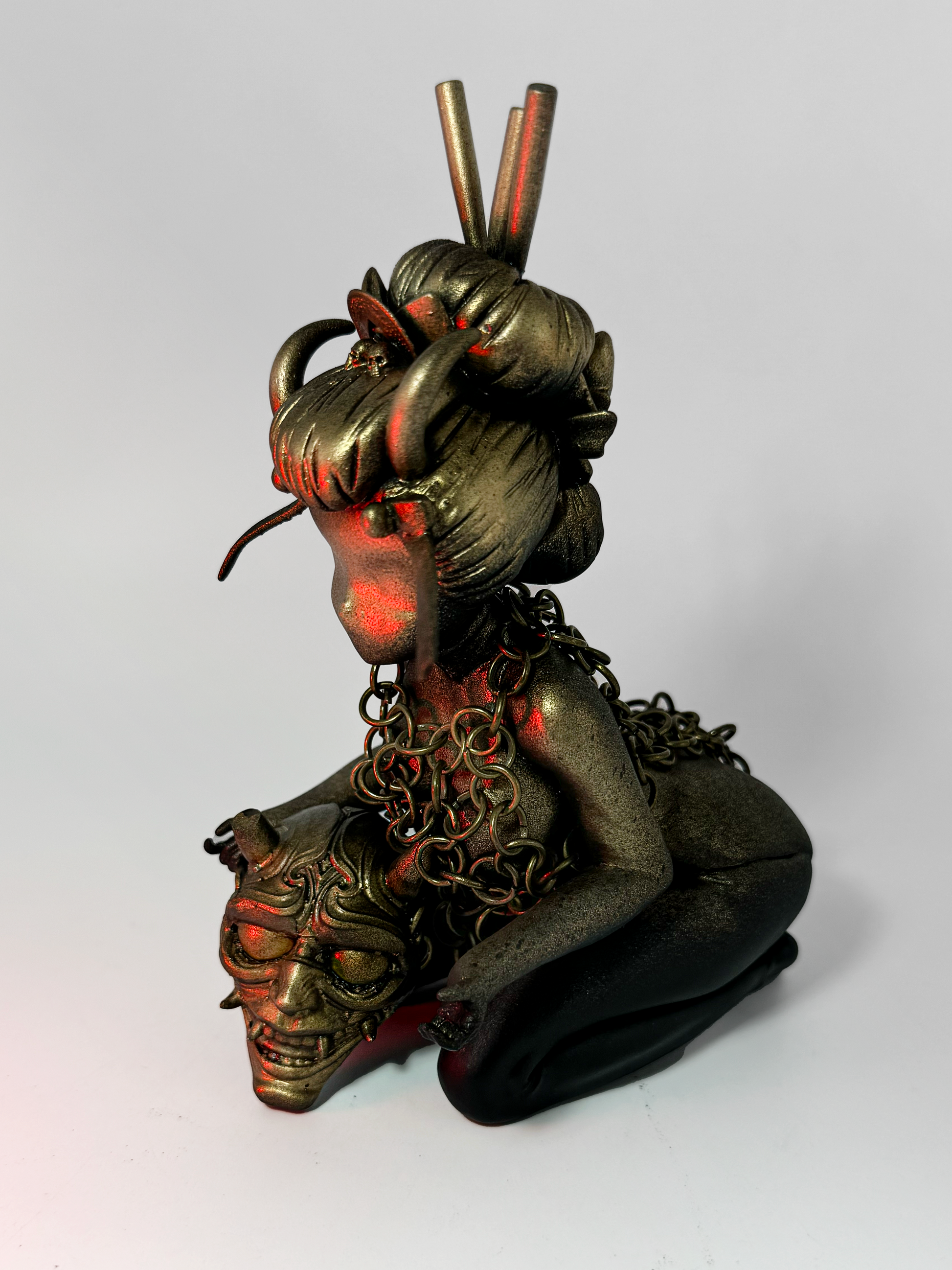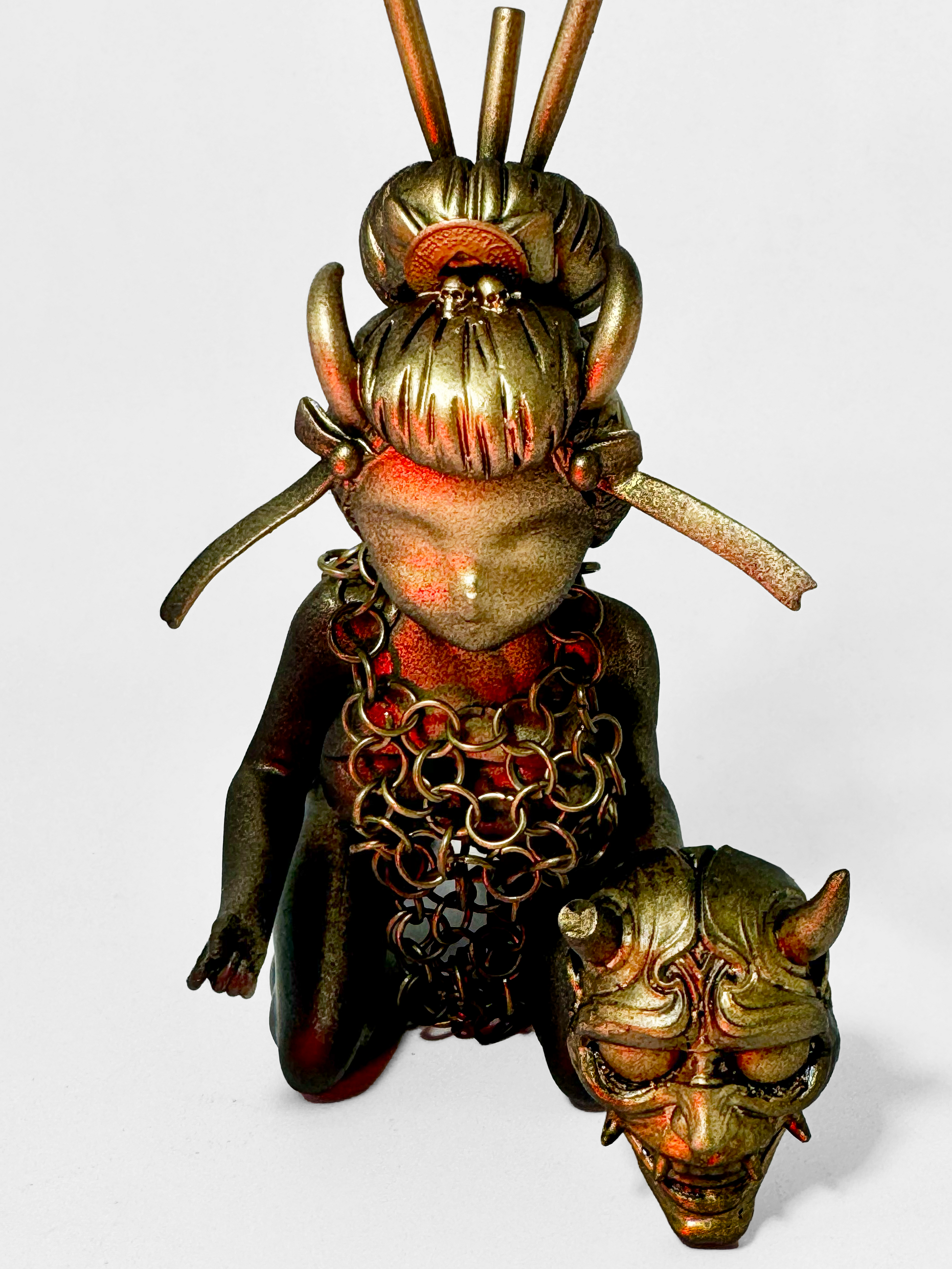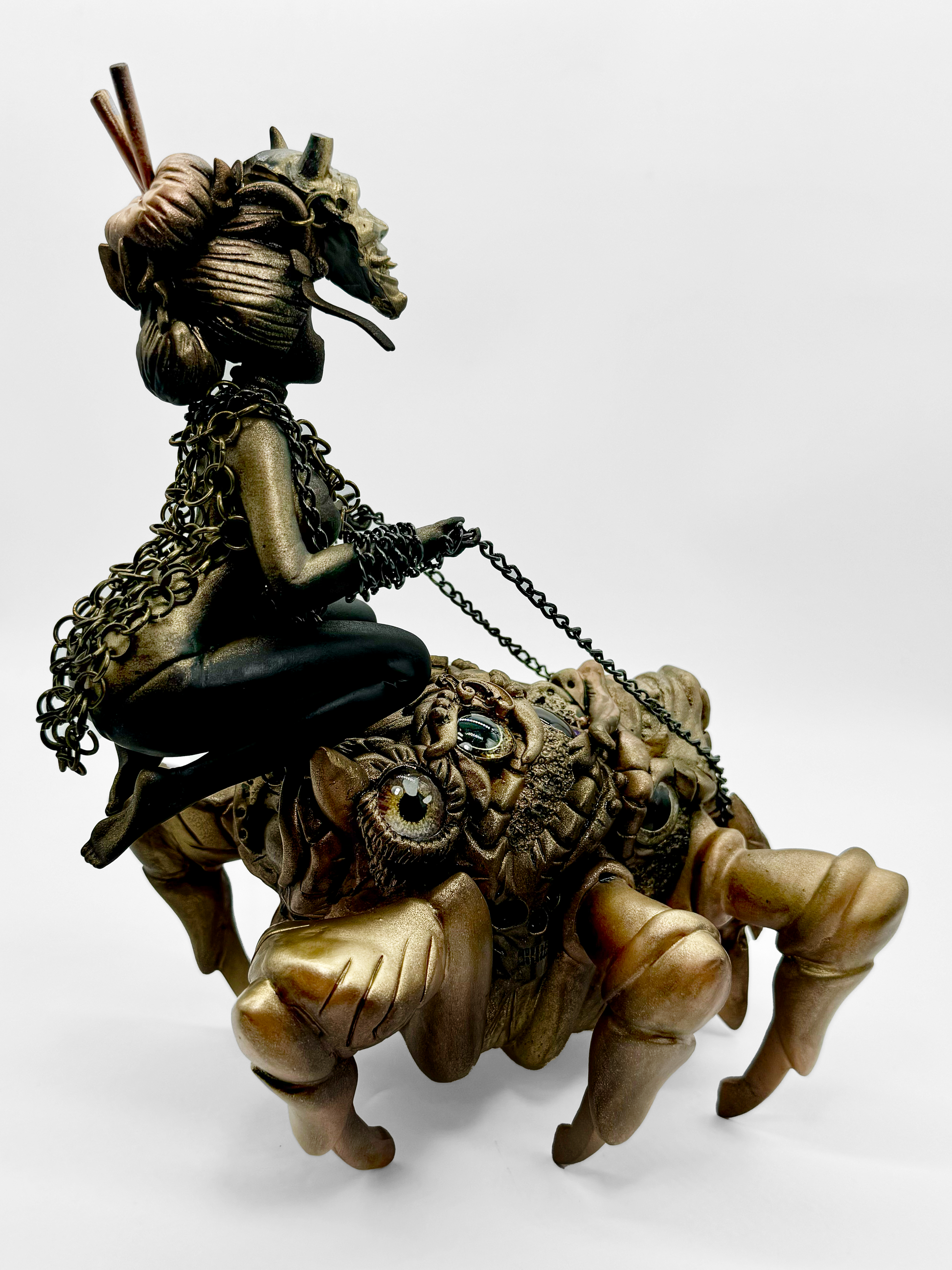 La tejedora maldita se eleva sobre una colosal araña, encarnando la tensión entre lo humano y lo monstruoso. La chica, oculta tras una máscara de demonio, simboliza el enfrentamiento con las sombras y el poder irresistible del deseo