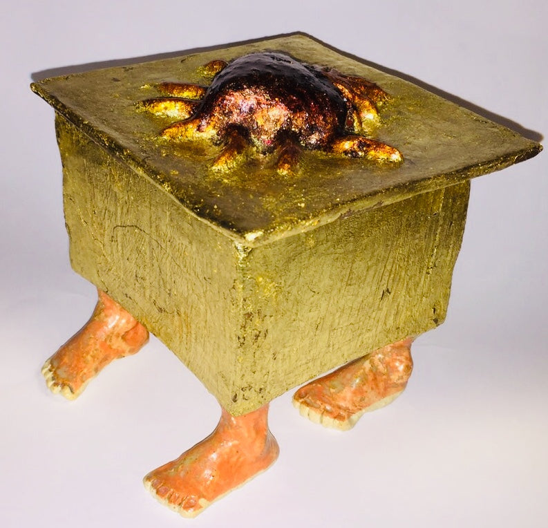 Esta obra realizada en 2019 es continuación de mi proceso creativo, partiendo de lo bidimensional o sea la gráfica, continuando con la materia o sea la pintura, continuar con el objeto real intervenido y concluyendo con la realización de una imagen tridimensional. Arca Cordis es una caja que como la de Pandora guarda muchos mitos evocando imaginerias envueltas en oro.