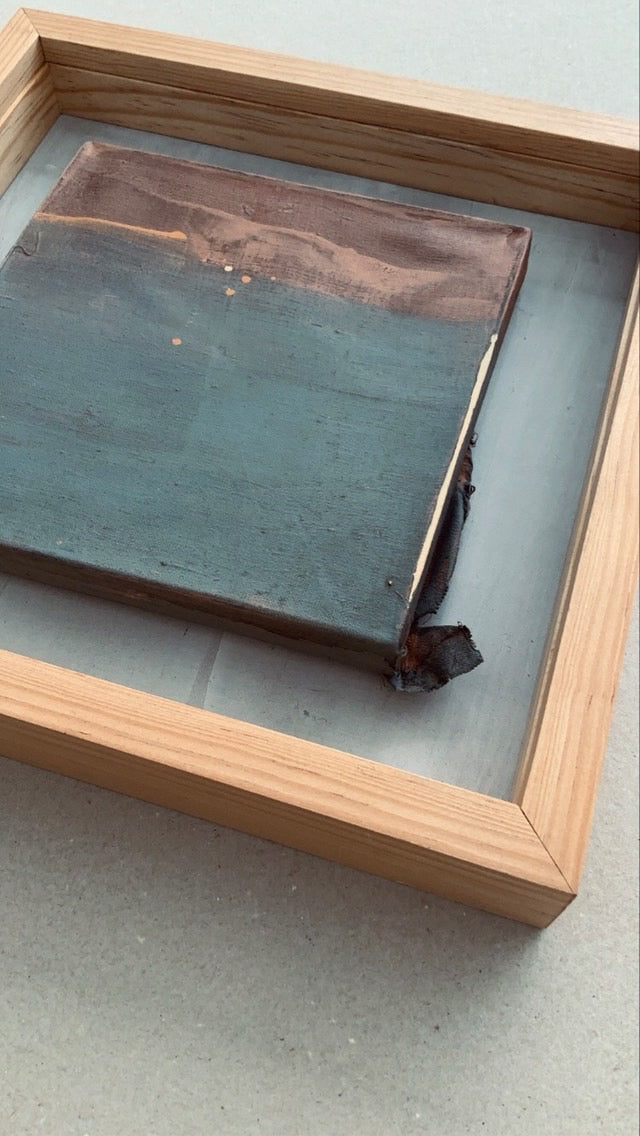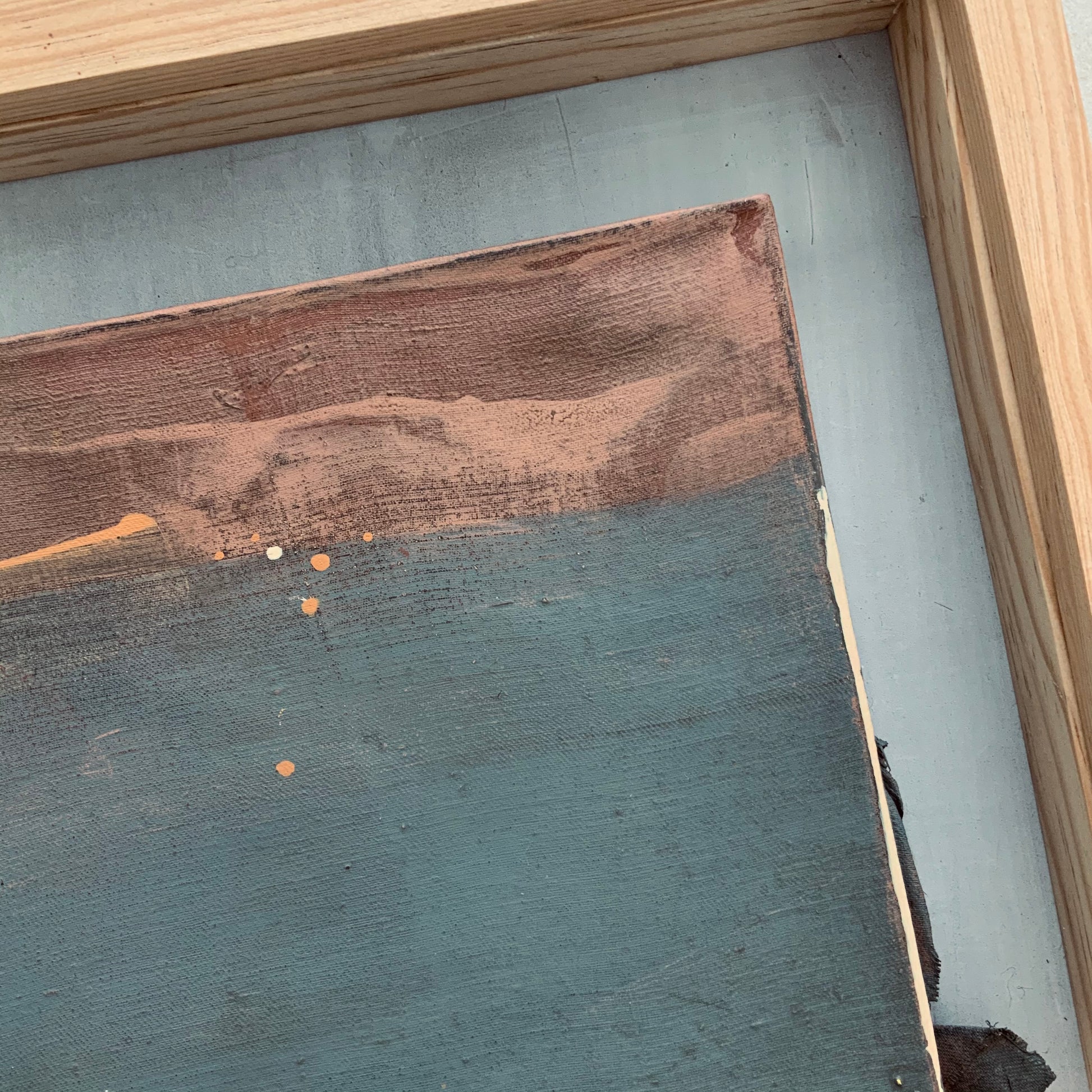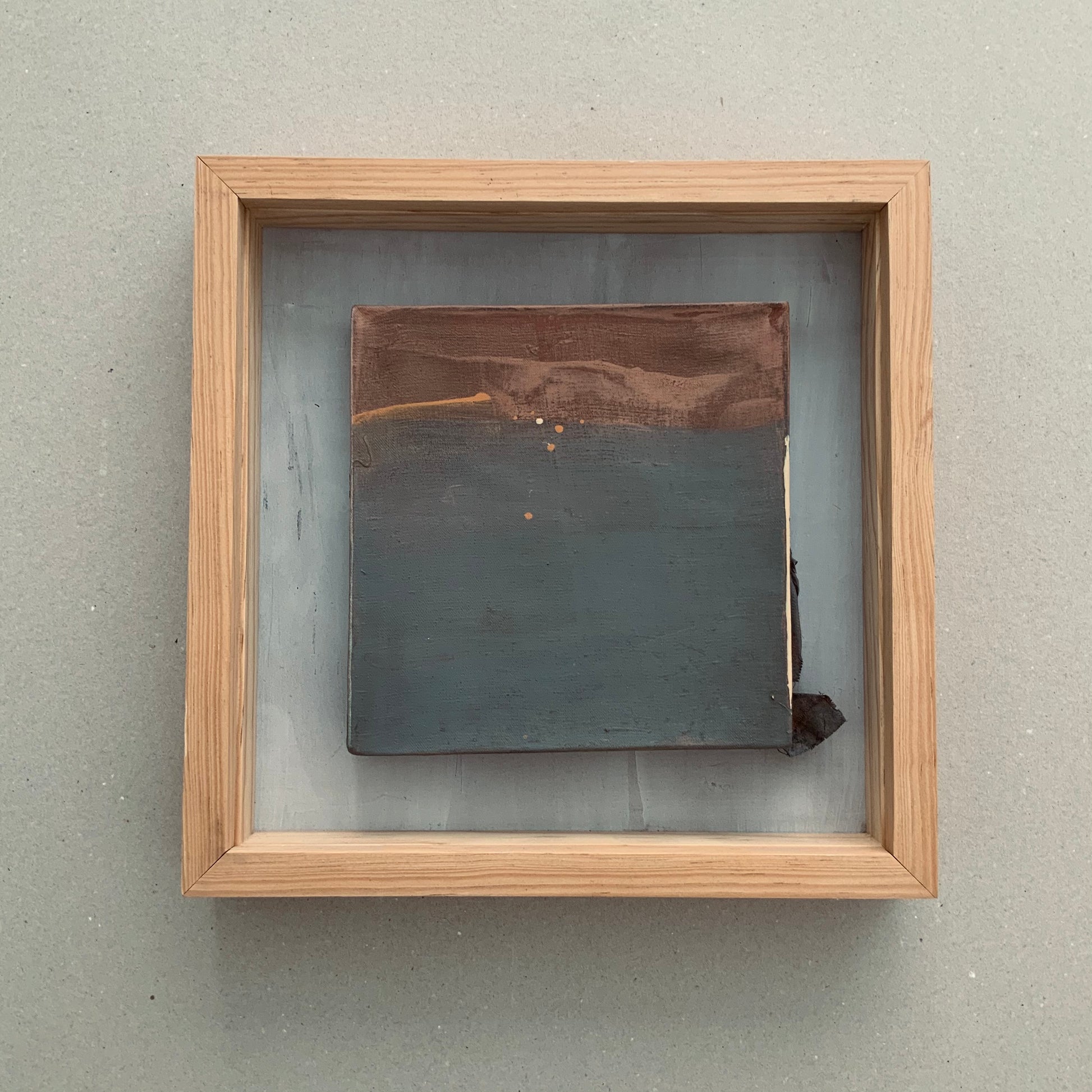 Pieza de colores sobrios, azules grisáceos, cremas, ocres y rosa palo.