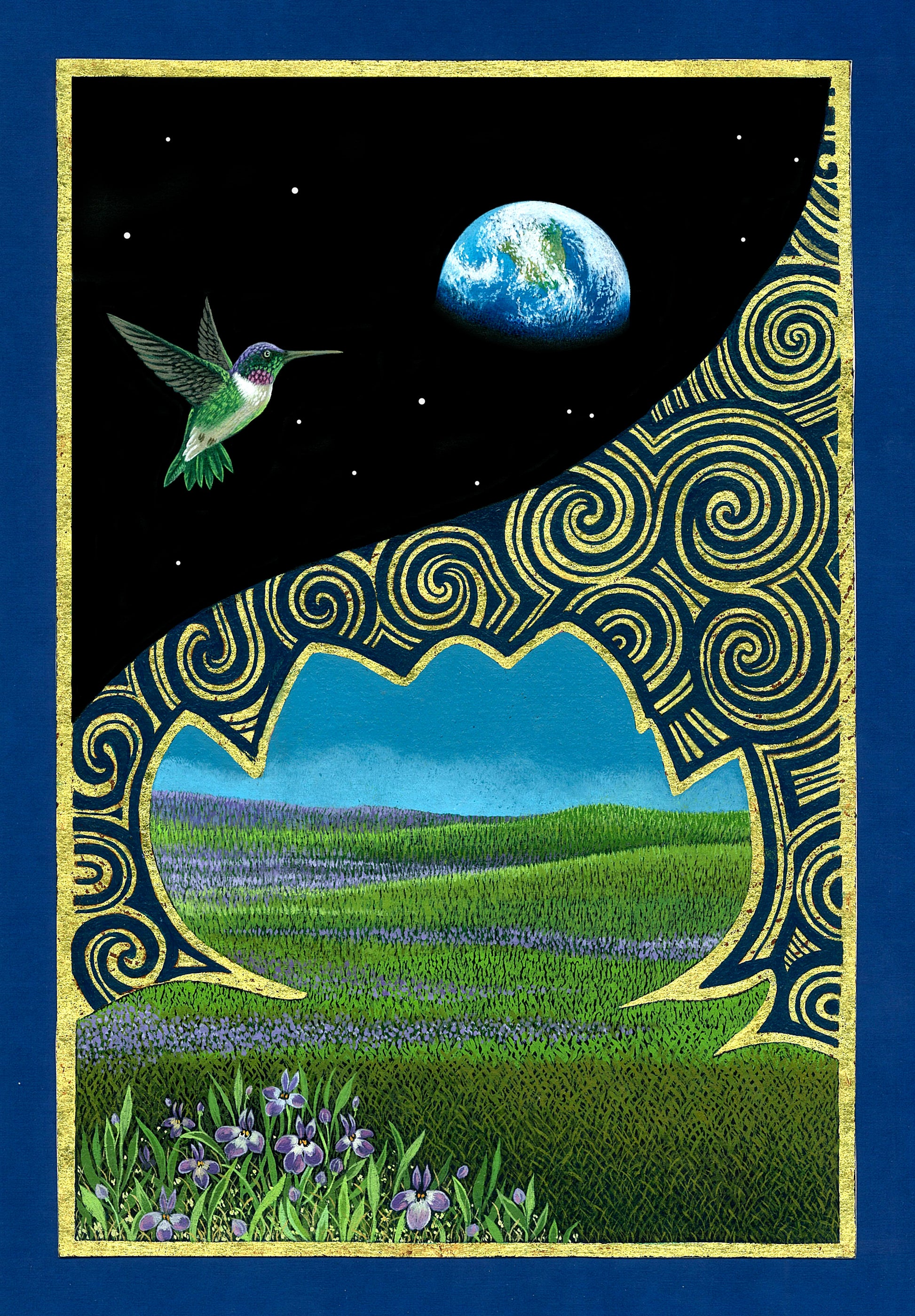 "Armonia" Una invitación a soñar que volamos en el paraíso enmarcado en una silueta de Flor de Loto con un pequeño colibrí que observa lejana a la Madre Tierra.