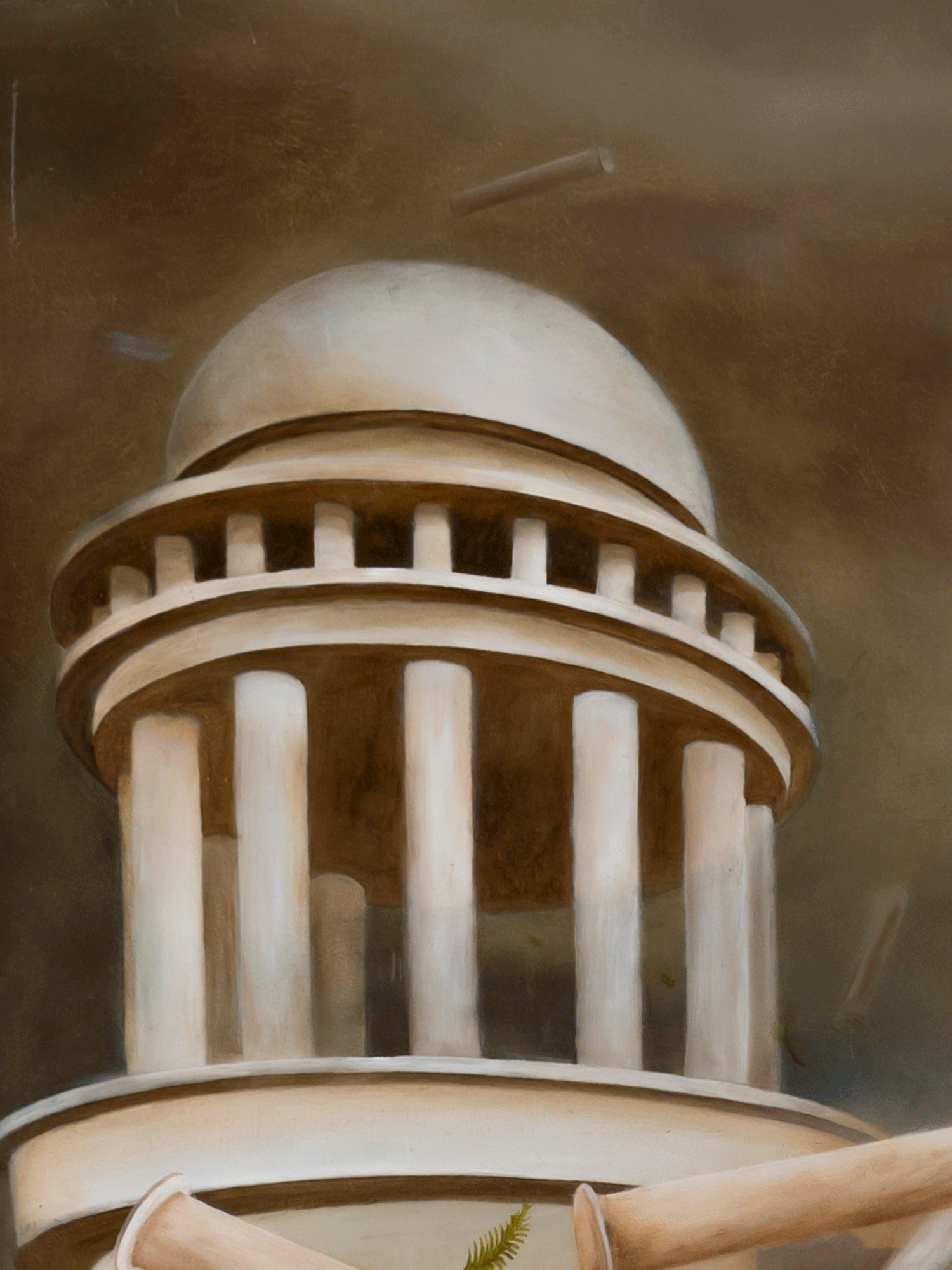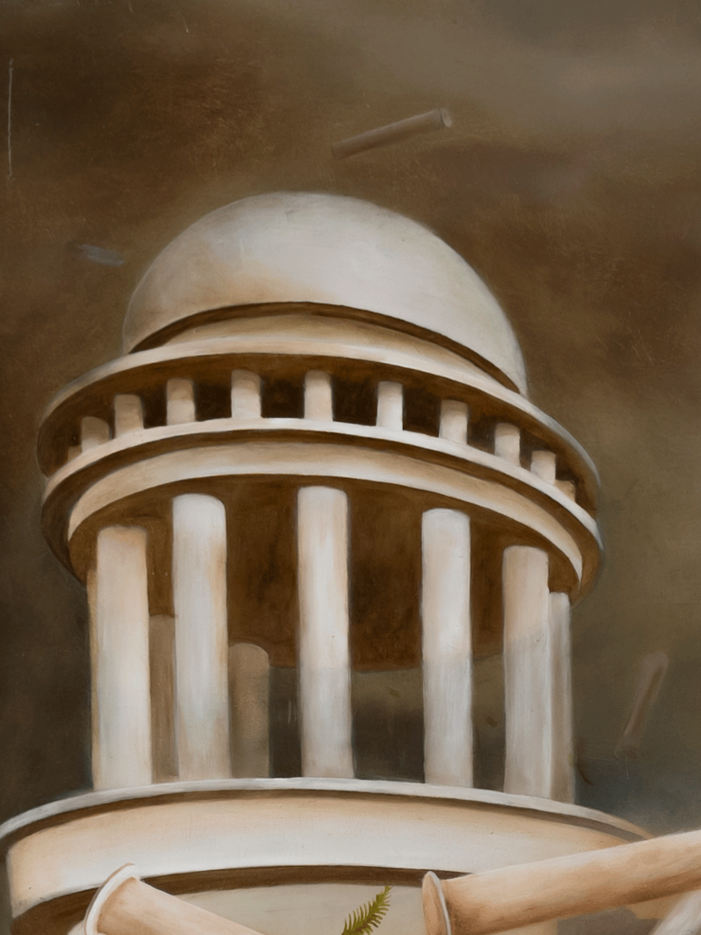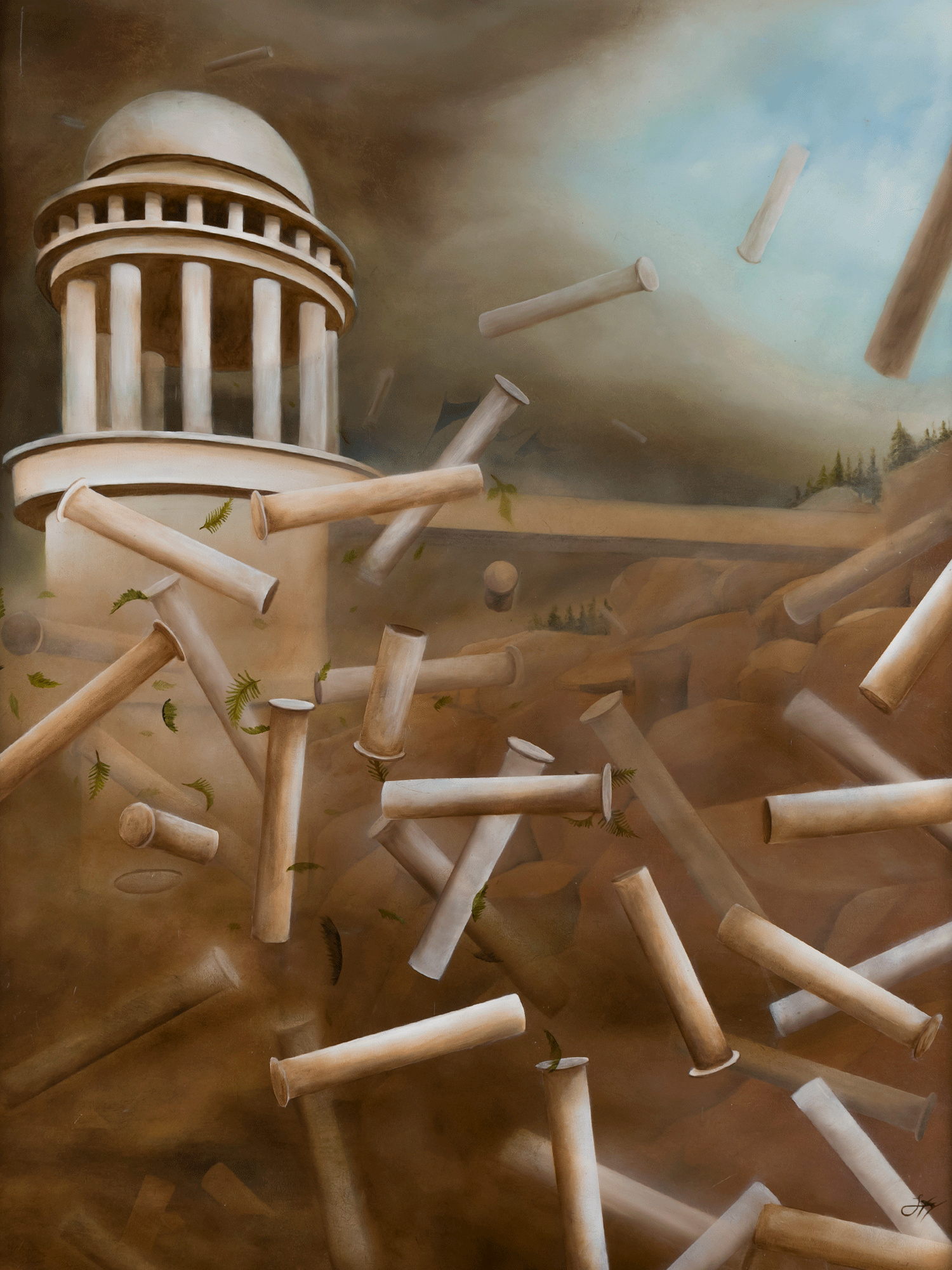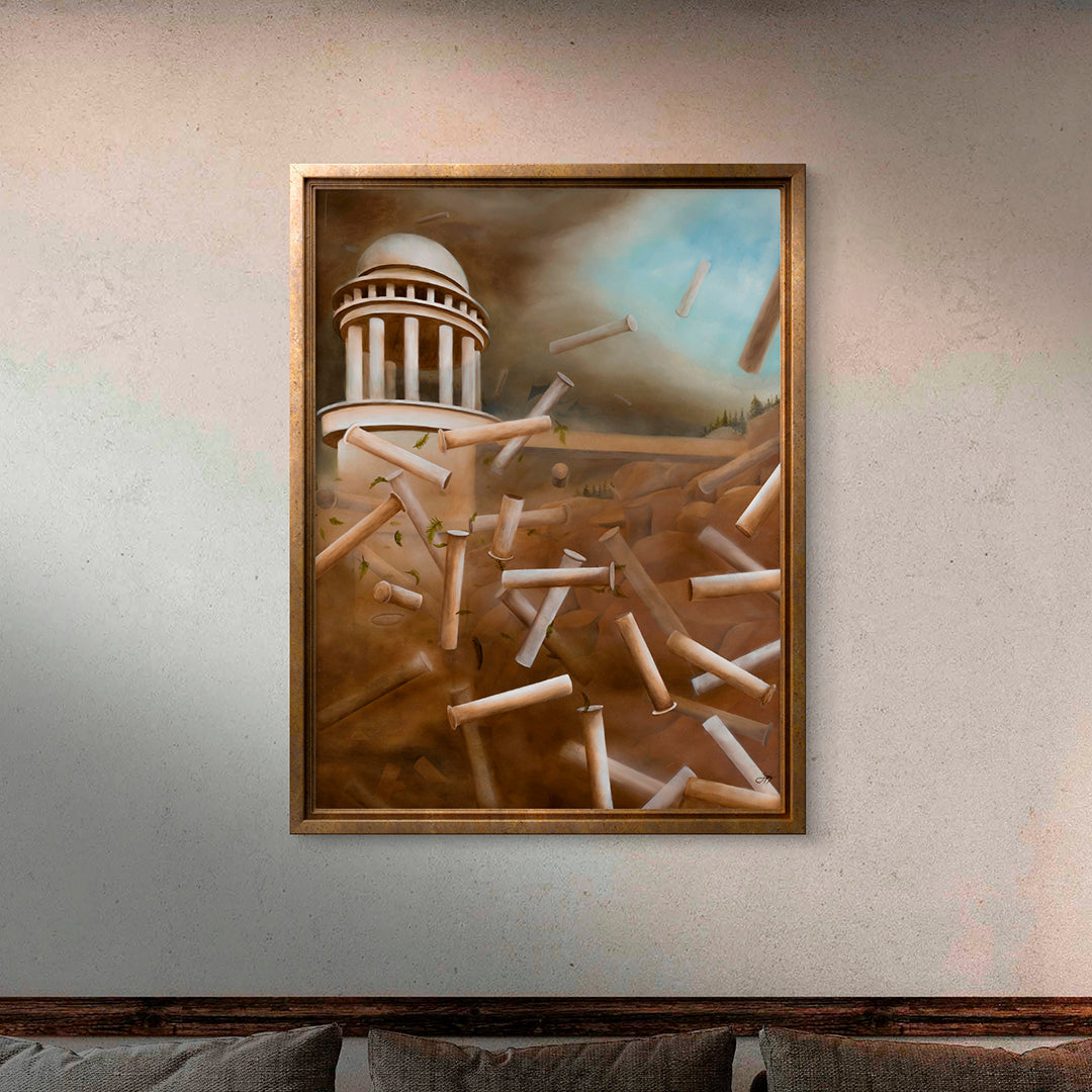 Retratando obras en situaciones fantasiosas y surrealistas. “Buscando la libertad constructiva en mis ideas, con amor hacia la arquitectura y al arte, pasé de la representación digital al pincel y pintura al óleo.” Realizada en agosto del 2021, es una obra 100% original del artista. Pintura al óleo sobre mdf de 6mm, (sin marco).