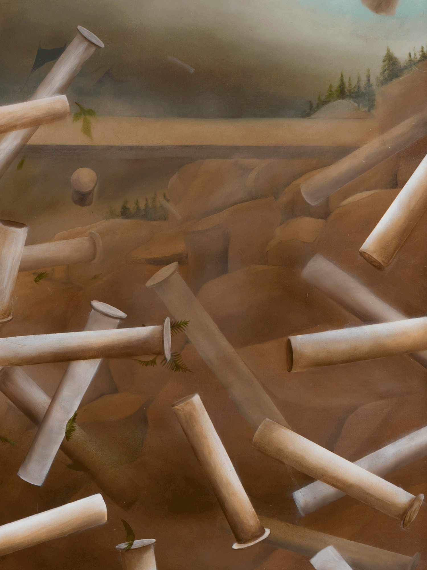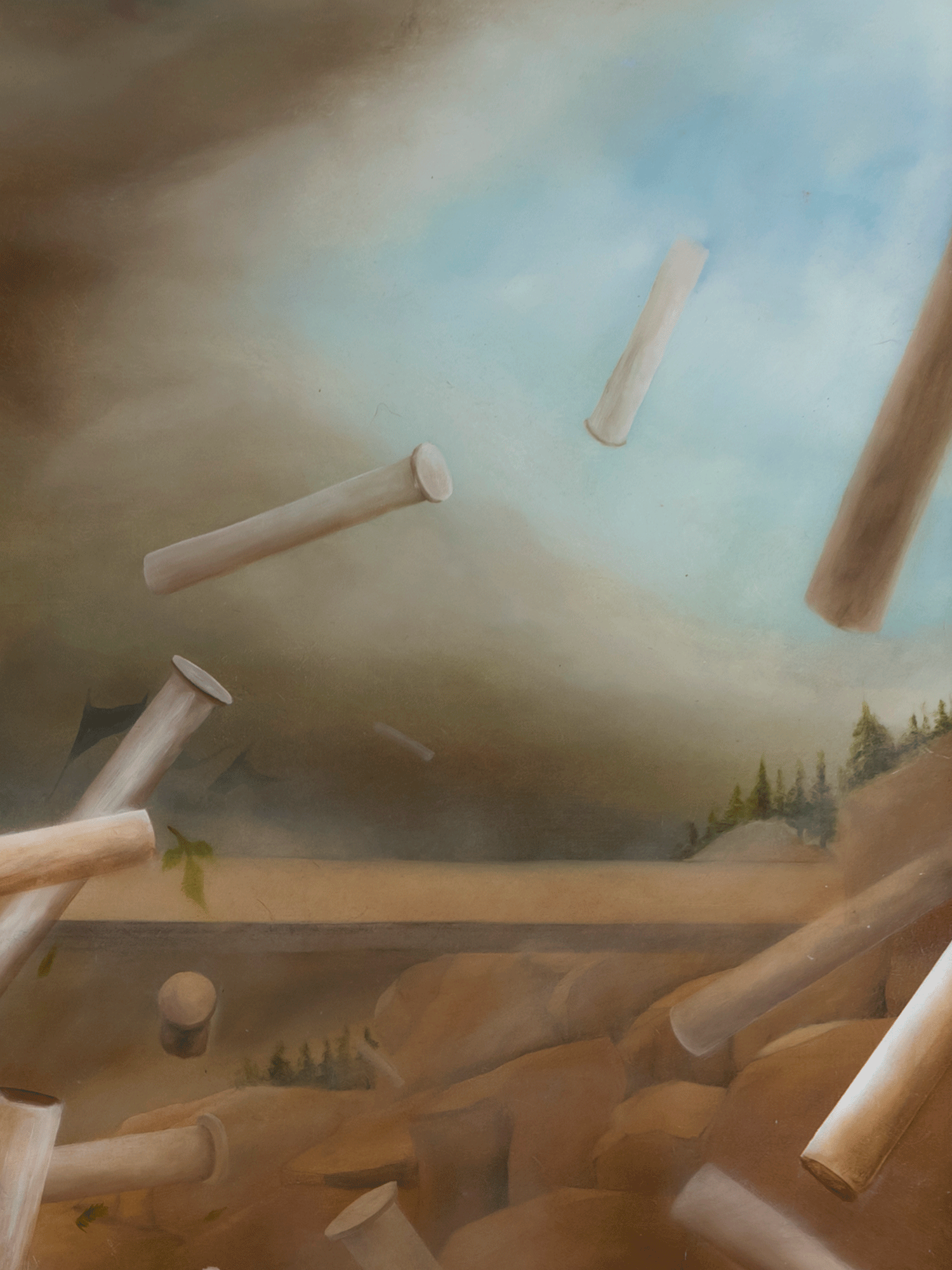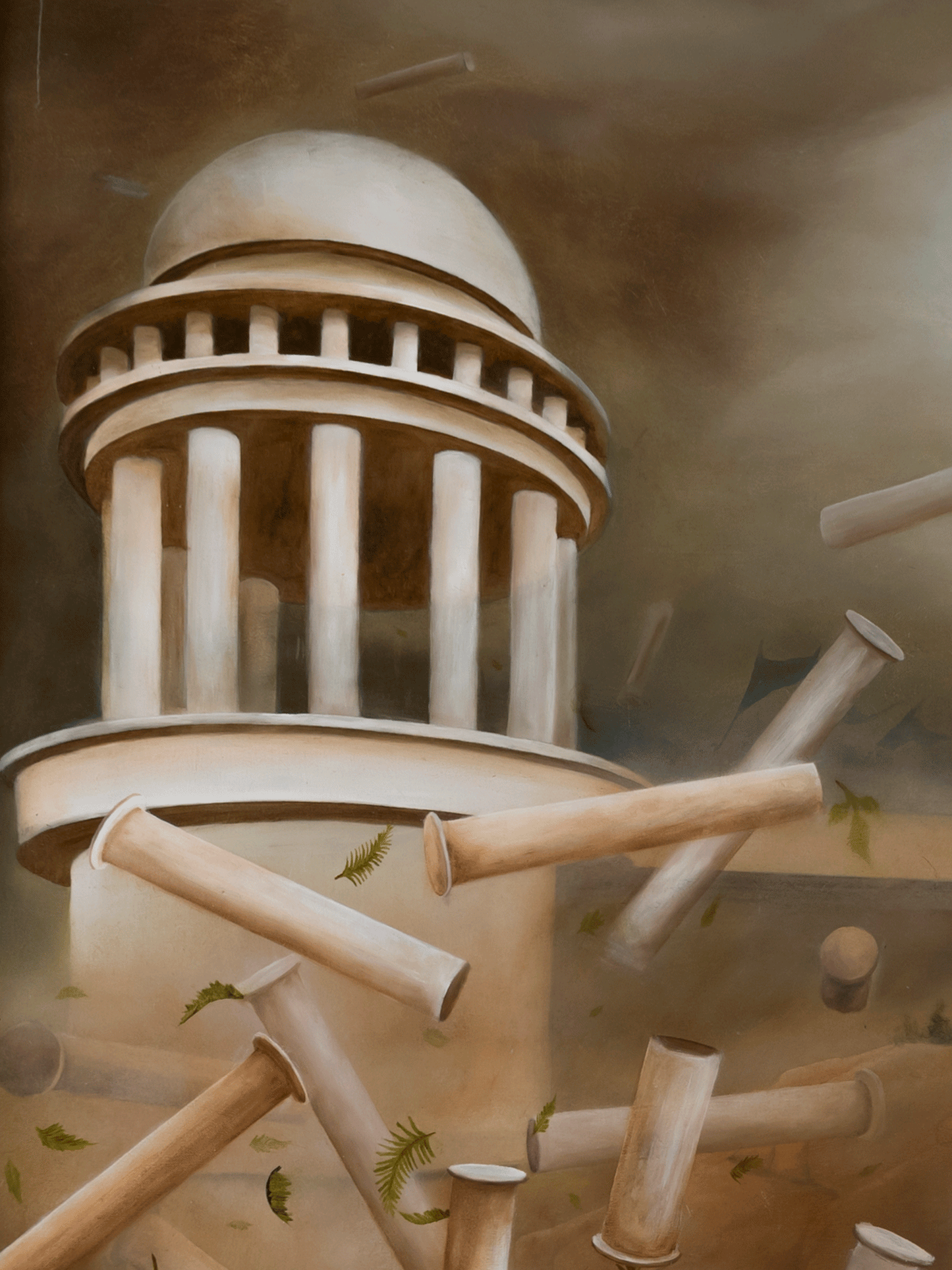 Retratando obras en situaciones fantasiosas y surrealistas. “Buscando la libertad constructiva en mis ideas, con amor hacia la arquitectura y al arte, pasé de la representación digital al pincel y pintura al óleo.” Realizada en agosto del 2021, es una obra 100% original del artista. Pintura al óleo sobre mdf de 6mm, (sin marco).