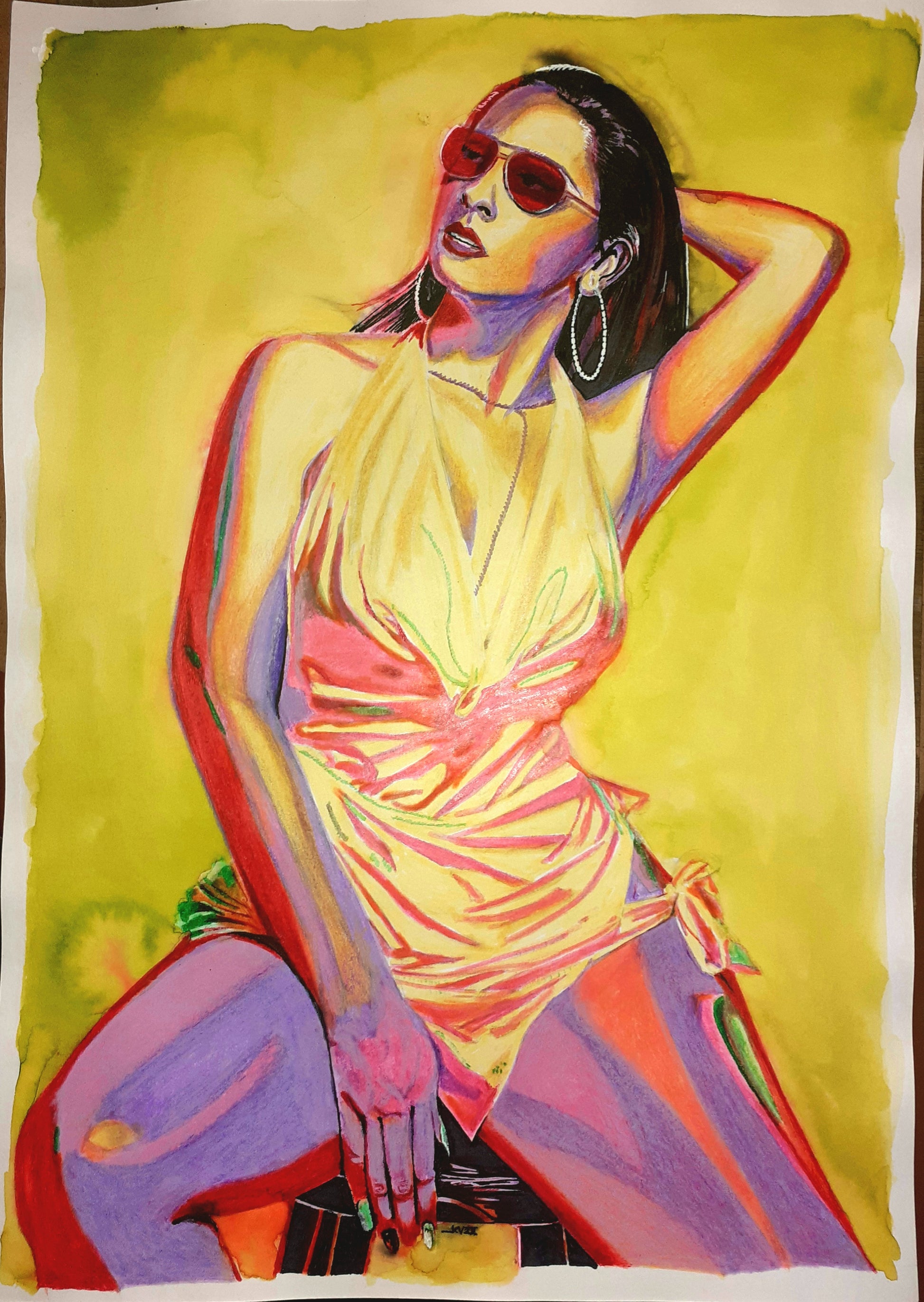 Retrato de mujer hecho con marcatextos y acuarela.
