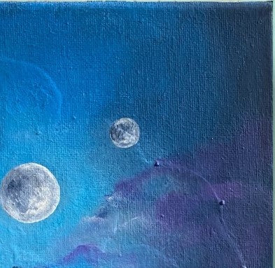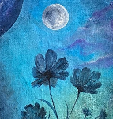 Escena pacífica dominada por tonos de azul, en donde las flores alargan sus tallos para ser iluminadas por tres cuerpos celestes en este pequeño paisaje nocturno y fantástico.