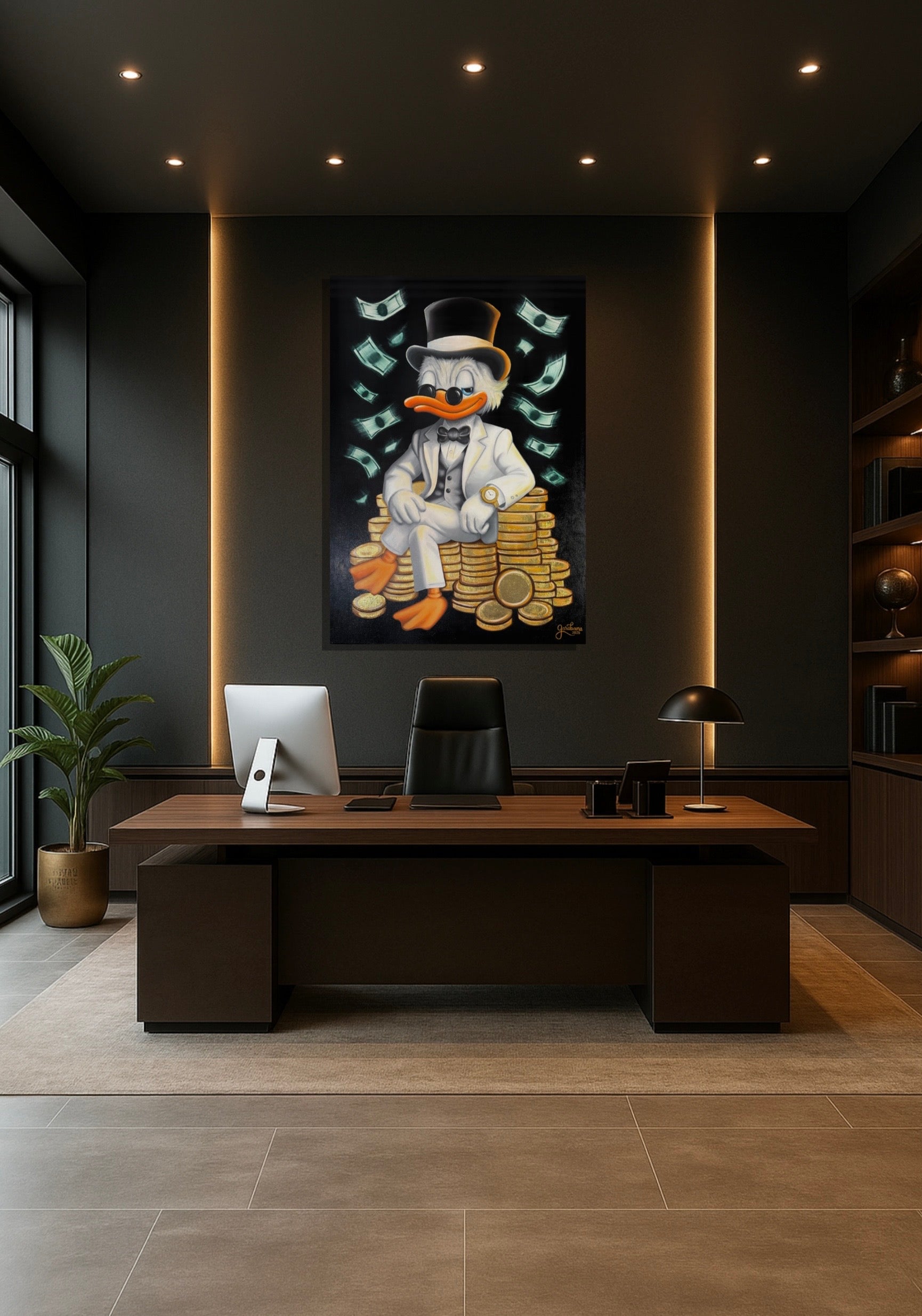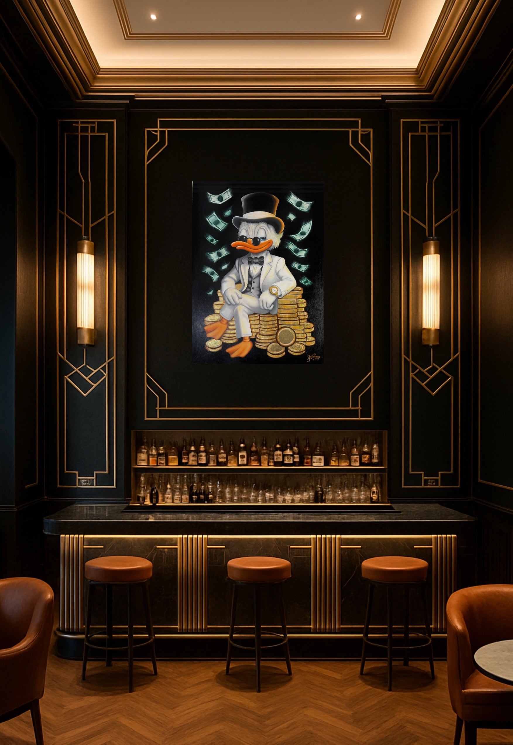Una nueva y diferente representación del famoso personaje "Rico McPato", donde se transmite el poder y la elegancia. Una obra original y detallada, con toques de hoja de oro que le agrega un toque único y cautivante.
