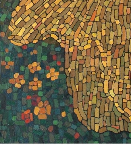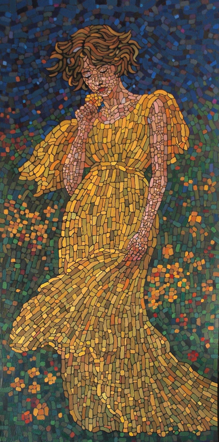 Bajo un lenguaje de mosaico contemporáneo, esta pieza de gran formato celebra la feminidad a través de una vibrante arquitectura de pinceladas. La figura emerge de un fondo nocturno mediante una danza de teselas doradas que dotan al óleo de una luminosidad orgánica, simulando un movimiento eterno que parece desprenderse del lienzo. Es una obra que transmuta la solidez de la técnica en una atmósfera de ligereza y gracia etérea.